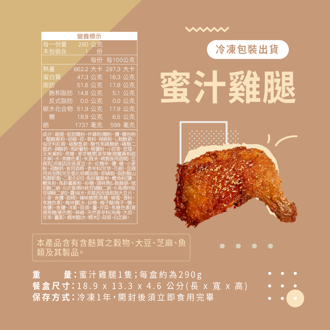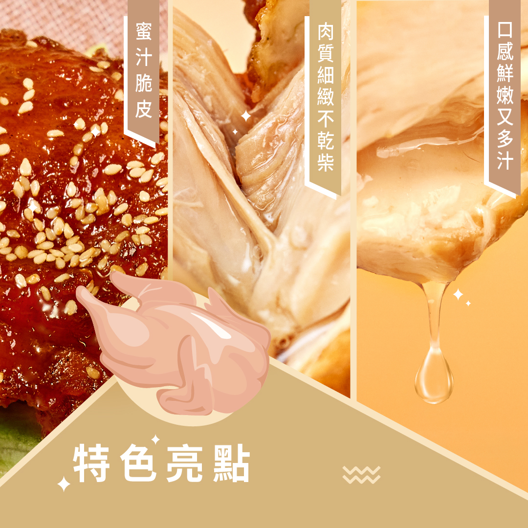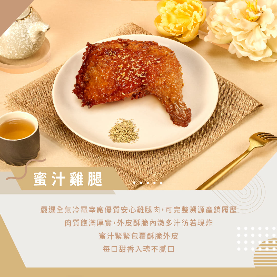 \ 從選肉到醃製,每一步都講究 / 嚴選臺灣在地氣冷雞腿肉,肉質飽滿厚實🍗裹上麵衣,經完美油溫酥炸,呈現金黃誘人的外皮再淋上主廚特製蜜汁,緊緊包覆在酥脆外皮上甜鹹交織的醬香層層滲入,每口甜香入魂,不膩口鮮嫩厚實的雞腿肉,大口咬下肉汁湧出,過癮滿分➺ 國產氣冷雞腿肉|大支厚實,肉質軟嫩➺ 主廚特製|蜜汁醬香,甜鹹交織,不膩口➺ 秘製比例|天然香料醃製,提出層次風味➺ 簡單加熱|即食方便,讓每餐更豐富