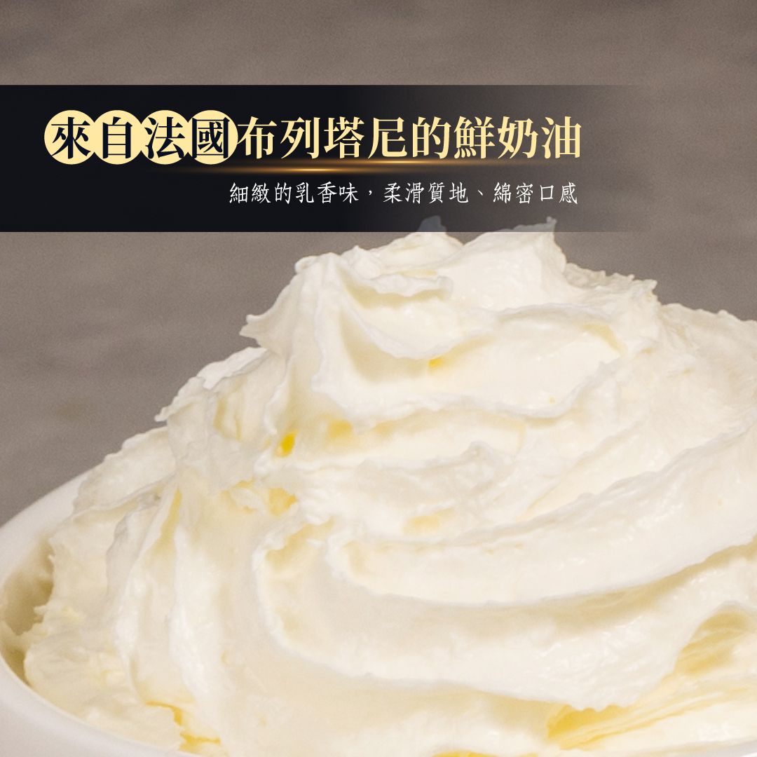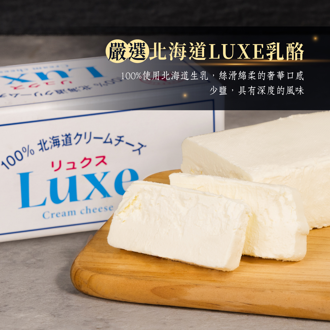 嚴選北海道LUXE乳酪100%使用北海道生乳絲滑綿柔的奢華口感少鹽,具有深度的風味來自法國布列塔尼的鮮奶油細緻的乳香味、柔滑質地、綿密口感