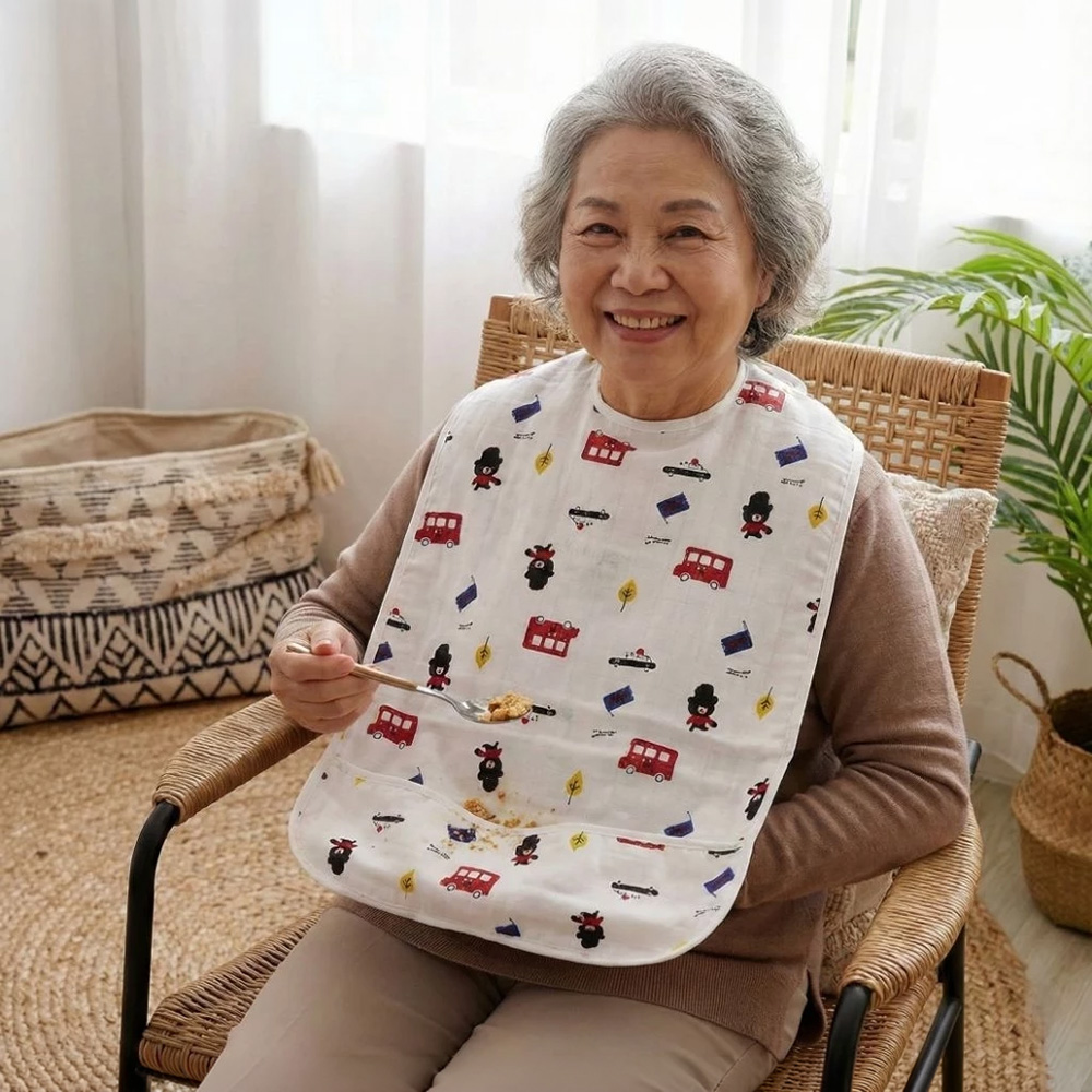 [凱美棉業] 2入組 頂級大人純棉紗布防水圍兜 貼心設計 精緻品質 細緻印花
