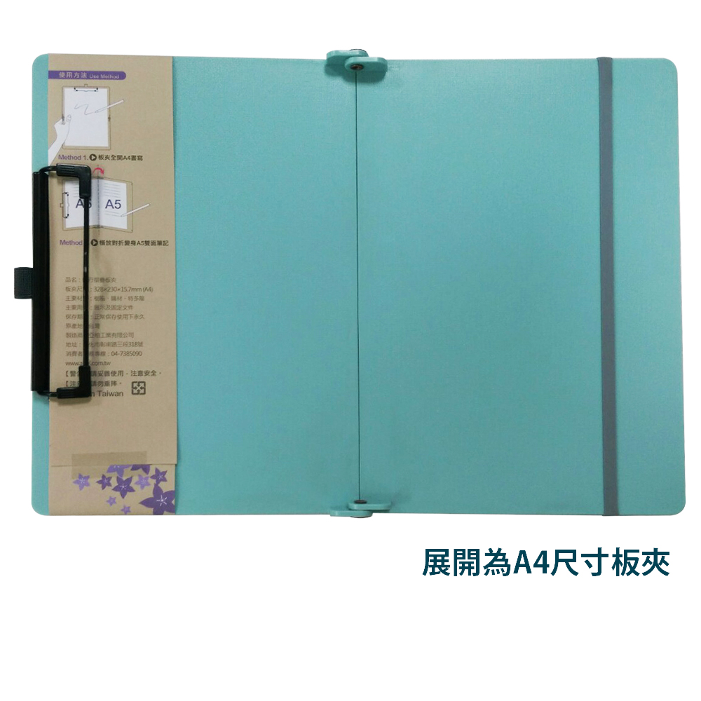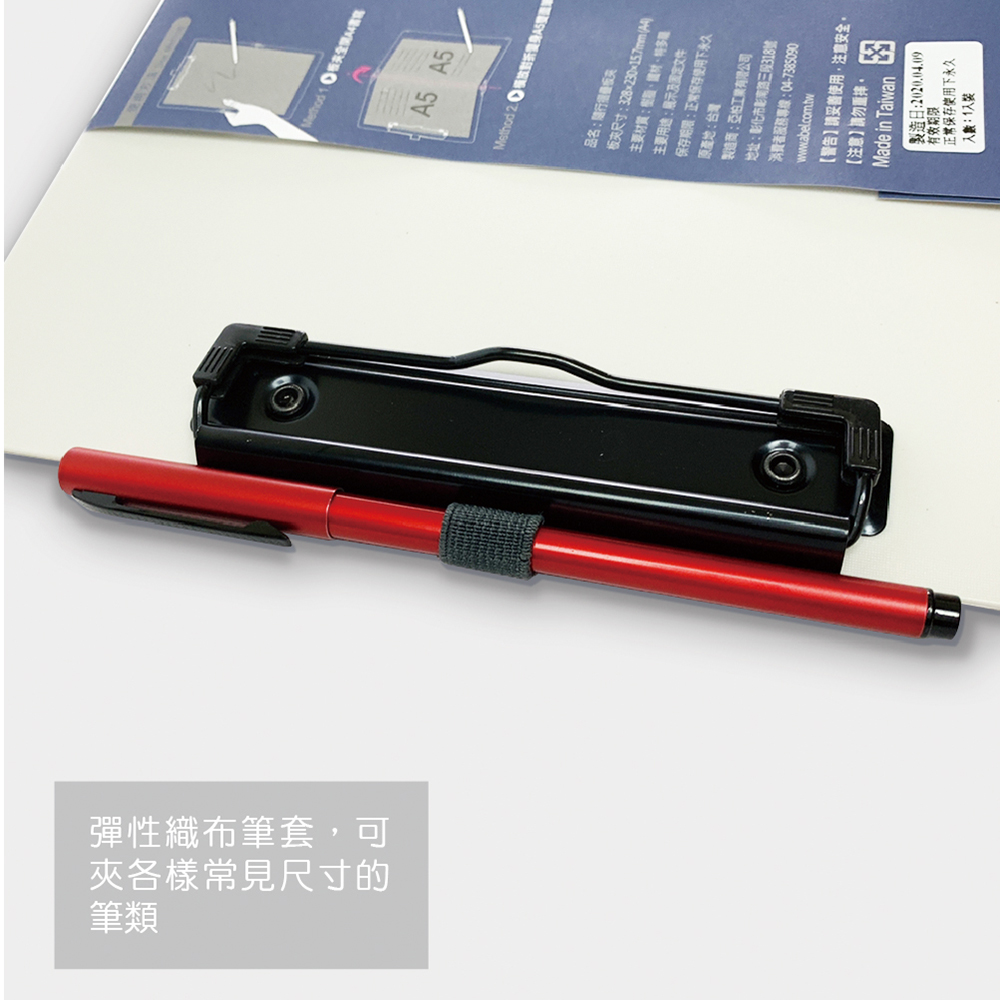 尺寸:32.8x23x1.57 cm 夾持紙張30張◇快速折疊,體積輕巧,方便攜帶,可輕鬆放入隨身包包。 ◇橫放對折可變身A5雙面筆記◇彈性編織筆夾