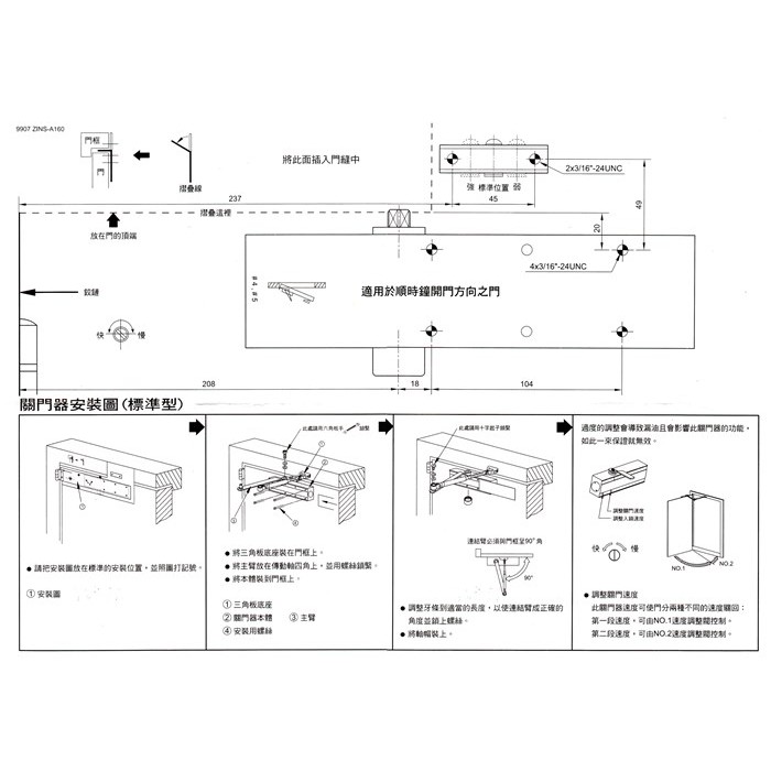 S984內停銀色超薄型門開角度90度適用門寬1050mm參考門重60-85kg內容物:門弓器、安裝說明、安裝紙規、螺絲配件一包適用門扇 : 厚重木門、玻璃門、重型鋁門請依照門片需求、要安裝的門重量選擇安裝於「拉」方向垂直式裝法,裝於門外往外開,裝於門內往內開適用於任何左開門或右開門,安裝時,鑽孔位置隨開啟方向不同安裝前請判別一下開門的方向 無論內開或外開門,都以「面對門的外側」為基準例如:鉸鍊在門的左邊稱之為左開門 鉸鍊在門的右邊稱之為右開門可調整關門速度※ 設有"開門緩衝角度",本體設計開門90°後,即產生阻力,已達到防止撞擊的目的※門扇開啟80°之內會自動回歸;若開啟90°以上,內附止動裝置會維持在開門的狀態門面與壁面之間應留的間隙,請依最大開門角度所需空間安裝台灣製造 ISO 9002 國際品質保證認證合格