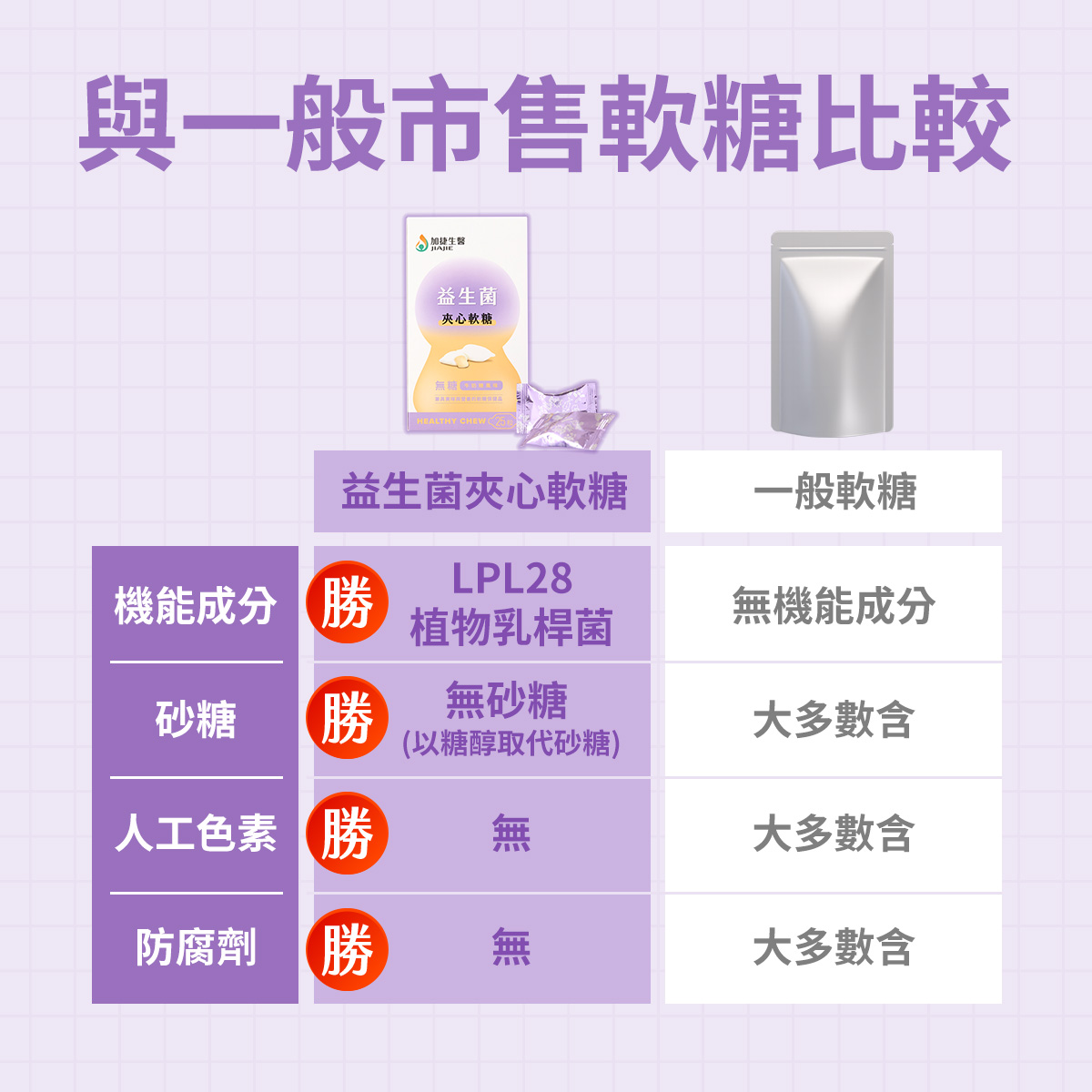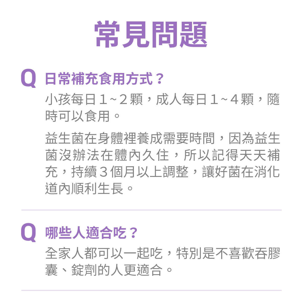 📍無糖配方,使用專利LPL28植物乳桿菌︳符合歐洲食品安全局QPS安全菌種︳專利LPL28植物乳桿菌,足量添加31毫克︳維持消化道機能,改變細菌叢生態︳軟糖劑型口感佳,更能提升孩童食用意願︳低溫低壓膠囊夾心製程,營養素完整保留︳不含砂糖、人工色素、防腐劑,奶素可食用關鍵成分:LPL28植物乳桿菌規格:25顆/盒,每顆3.6公克劑型:軟糖葷素別:奶素產地:台灣