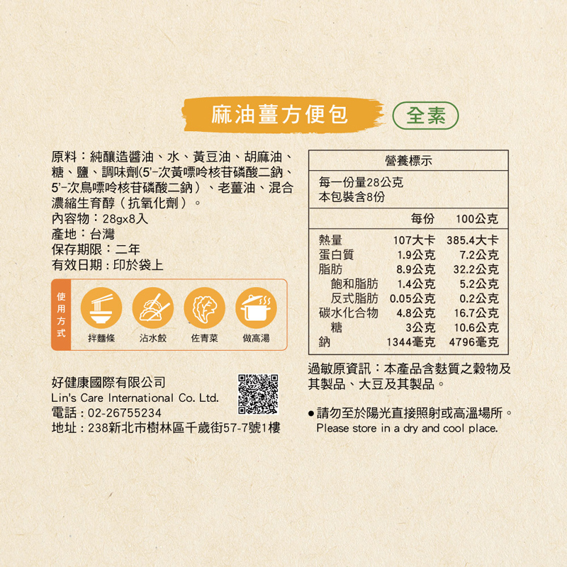 #全素#醬料包#佐餐#料理#拌麵#調味【 就醬拌,伴你度過每一餐 】就醬拌方便包使用各式香料,堆疊出富有層次的飲食特色,就算以簡單的烹煮方式調理,一樣可以變化出色、香、味俱全的美味料理。嚴選食材,打造茹素者可放心食用的純素醬料,無論是拌麵、拌菜,或是加入湯裡作為調味都合適,葷食者也能夠輕鬆入門喔! 陪伴你輕鬆完成料理,餐桌菜餚不再一成不變!就醬拌系列方便包,是你的最佳方便快速料理神隊友! 【 麻油薑方便包 】以手工純釀醬油為基底,口味甘醇鹹香,加上高級濃厚的麻油,香味十足,再以老薑油的辛香作為點綴,襯托出醬汁協調又溫和的好滋味,除了適合製作拌麵、拌飯的佐料,也推薦用來製作涼拌菜,多種層次的味覺感受,一年四季都合適!● 以古法、純手工釀製的無基改醬油,滋味甘醇鹹香● 麻油香氣撲鼻,味道濃郁原料:純釀造醬油、水、黃豆油、糖、鹽、調味劑(5’一次黃嘌呤核苷磷酸二鈉、5’一次鳥嘌呤核苷磷酸二鈉)、老薑油、混合濃縮生育醇(抗氧化劑)。內容量:28g/包(一袋共 8 包),三袋組有效期限:印於袋上保存期限:兩年■ 廠商名稱 : 好健康國際有限公司■ 廠商電話 : 02-26755234■ 廠商地址 : 238新北市樹林區千歲街57-7號1樓■ 投保產品責任險字號 : 0525字第23AML0004952-2號■ 食品業者登錄字號 : H-153997270-00000-7