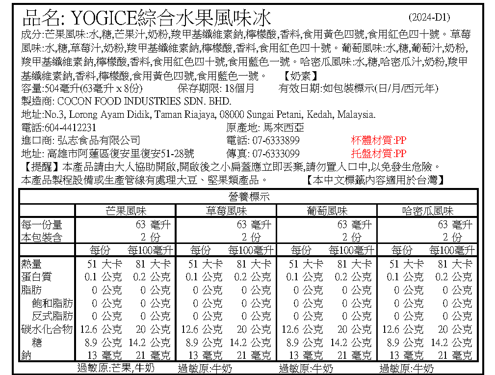 A.可康YOGICE棒棒冰(綜合水果風味) 504ml (63mlx8支)