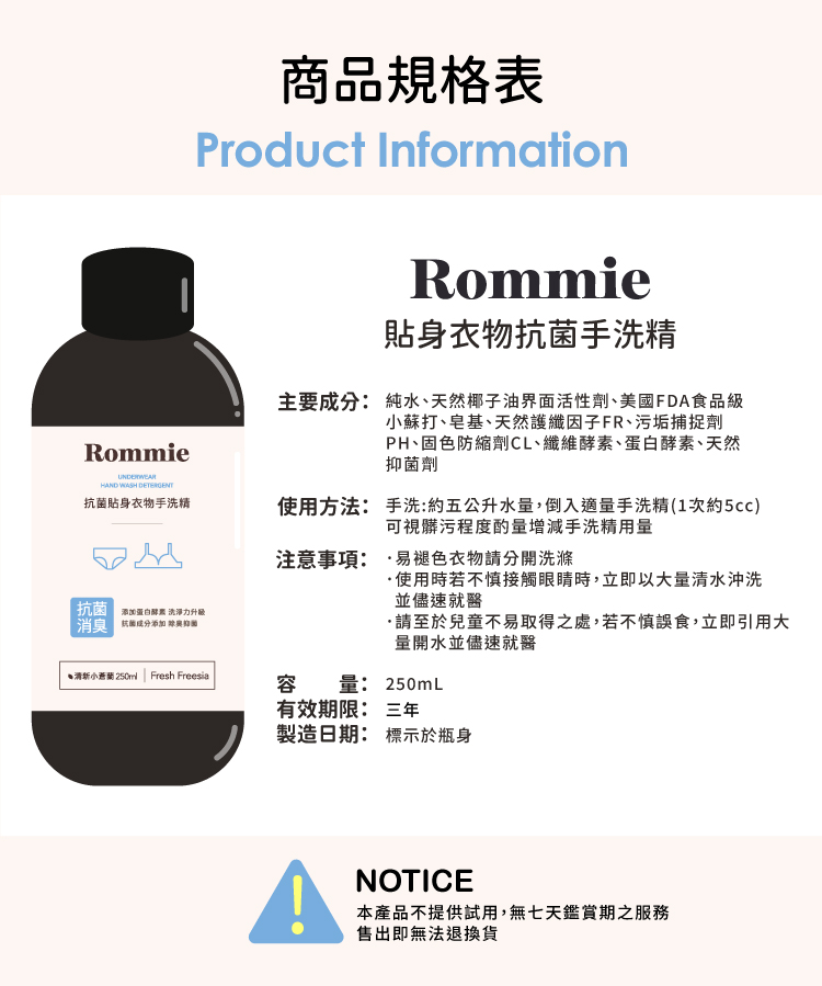 Rommie 清新小蒼蘭貼身衣物抗菌手洗精 250ML(售出不做退換貨) Y088