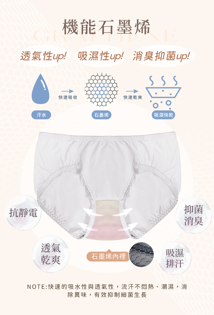 石墨烯抑菌褲底 — 有效抑菌、吸濕透氣,流汗不悶不尷尬,拒絕異味!