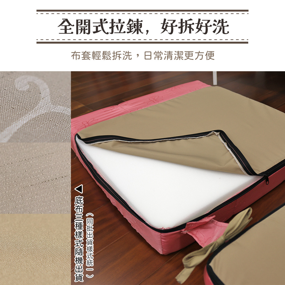 ◆商品特色:(1)全開式拉鍊設計,布套可拆(2)附綁帶,可固定在椅背上(3)可堆疊,收納方便(4)適用木椅、和室坐墊,椅背、椅坐可拆開使用(5)台灣製造◆商品資訊: 尺寸:(攤平) 長約 127cm*寬約 55cm*厚約 11cm(背墊)高約 58cm*寬約 55cm(坐墊)深約 55cm*寬約 55cm*厚約9公分(綁帶)長約25公分(綁帶加長20公分一組+100元)(以上規格為人工丈量會有微誤差約正負2公分內)重量:約2.5kg/一組表布:聚酯纖維(Polyester) 內材:舒適泡棉 顏色:桃紅舞曲/銀色舞曲/粉紅戀歌/浪漫紫戀產地:台灣 ※小叮嚀:(1)布套可拆洗,勿烘乾※其他特殊注意事項: