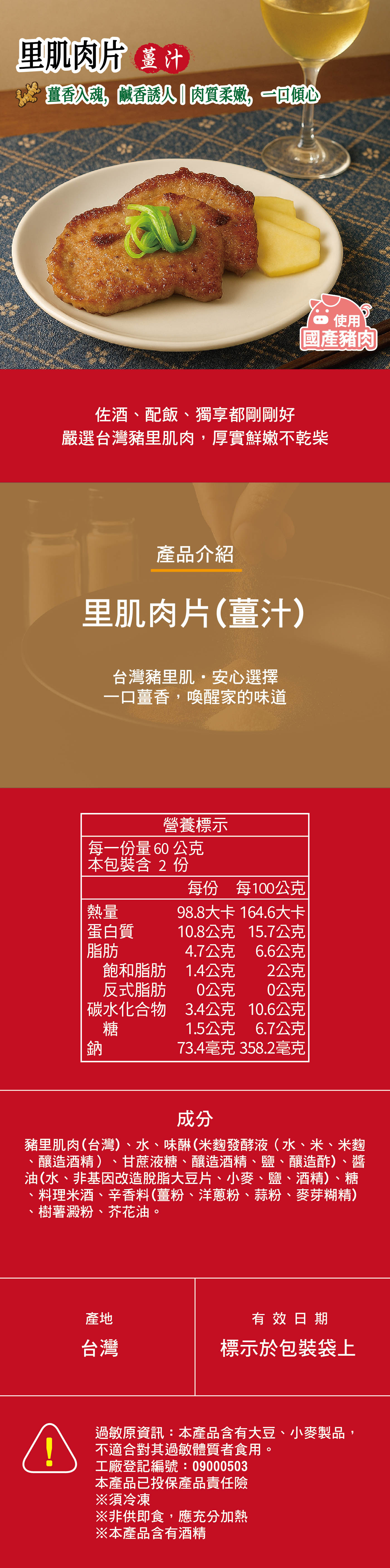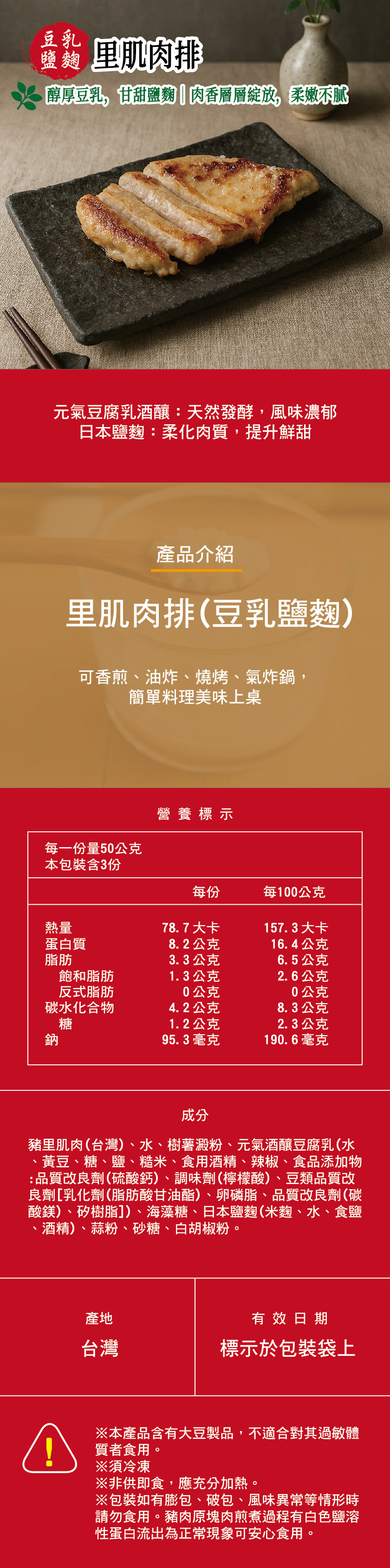 內容物:台灣心肉丁香腸(原味)200gX1包台灣心肉丁香腸(黑胡椒)200gX1包里肌肉片(薑汁)120gX1包豆乳鹽麴肉排150gX1包商品介紹:台灣心肉丁香腸(原味)台灣心肉丁香腸(黑胡椒)●限定使用台灣豬後腿肉丁●使用日本進口膠原蛋白腸衣●無添加亞硝酸鹽、無防腐劑、無瘦肉精●堅持肥瘦黃金比例配方,肉質細膩、口感彈牙里肌肉片(薑汁)●肉質柔嫩,一口傾心●使用國產豬肉,安心選擇●獨特醬汁醃漬入味豆乳鹽麴肉排●嚴選優質台灣健康豬肉●獨特醬汁醃漬入味●口感紮實有彈性●元氣豆腐乳酒釀:天然發酵,風味濃郁●日本鹽麴:柔化肉質,提升鮮甜