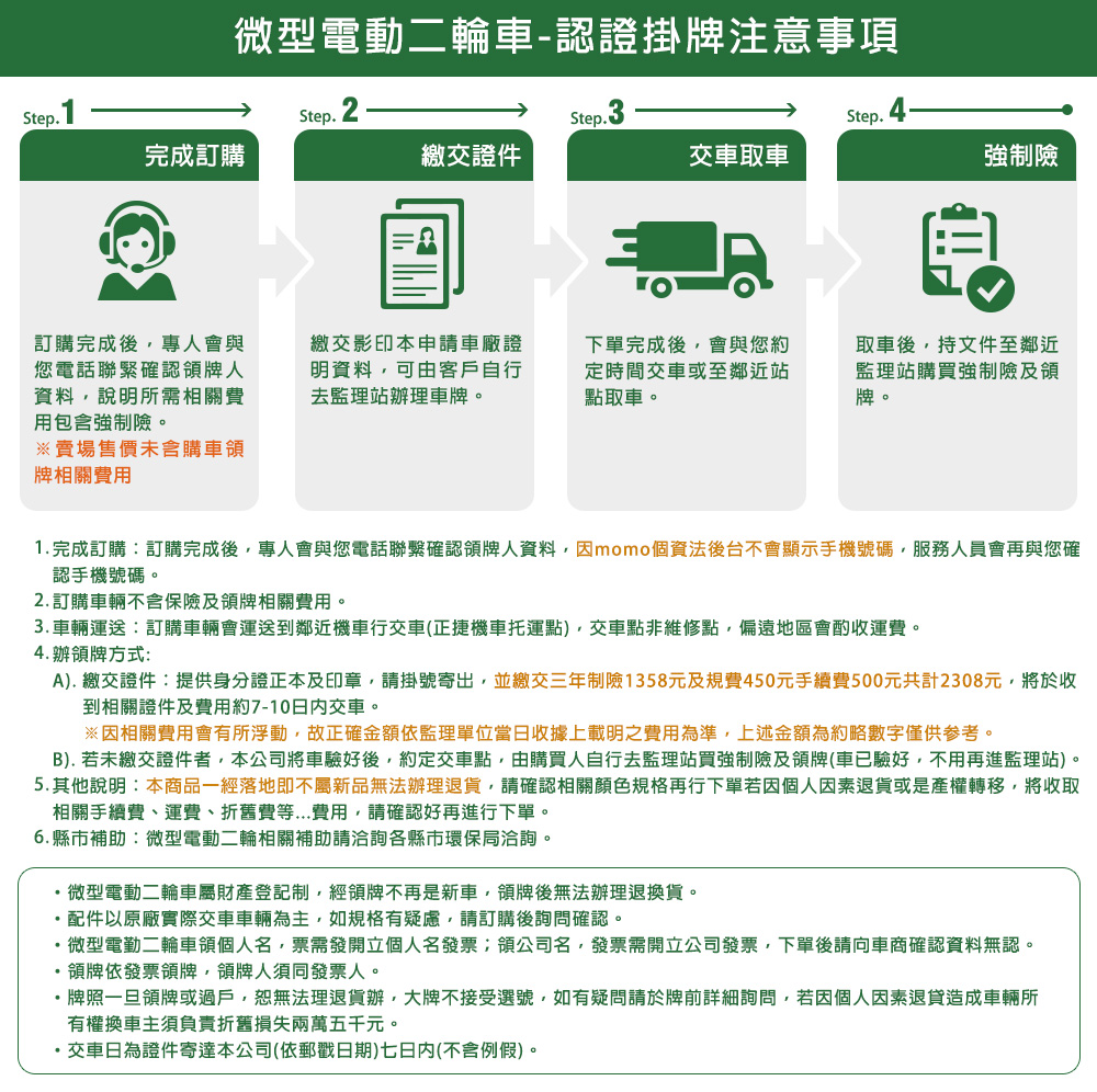 (車架)商品規格:車 型: PEG-070車身尺寸:170*69.5*105cm輪胎尺寸:3.00-10電池型式:鉛酸電池電池規格:48V15AH使用電壓:110v-120v充電時間:6-8小時煞車系統:鼓剎系統及煞車斷電安全裝置控制系統:正弦波電控無刷輪轂馬達最大功率:869.23W 欠壓保護:有最高時速:不超過25km/h續航里程:約20~25km爬坡能力:約10%安全載重量:100kg定速巡航:有前/後方向燈:前有/後有備 註:註1. 續航力會隨著各種因素而變化,例如騎乘重量、坡度、路面情況等等,另外正常情況下電池會逐漸老化,也會影響續航力。註2. 最高續航力為實驗室測試值,模擬55Kg載重於定速25Km下的最高行駛距離,實際續航力因載重條件、個人騎乘習慣、騎乘路況與天候狀況不同而有所差異。註3. 充電時間是電池從零電量至充飽電的耗時,實際充電時間視當時殘餘電力與充電功率大小而定。本商品標準配備:車體 X1保卡及說明書 X1鉛酸電池x1充電器X1(組)後視鏡X1(組)保固內容:以本車所提供之品質保證書內容條款詳述,鉛酸池保固六個月,車架、電機馬達、電子控制器、充電器、保固一年, 各項開關按鈕、轉把、喇叭、DC轉換器保固三個月,外殼塑件、燈泡、車胎、剎車皮屬消耗品無提供保固。 保固適用地區:台灣本島所使用之本公司電動自行車。