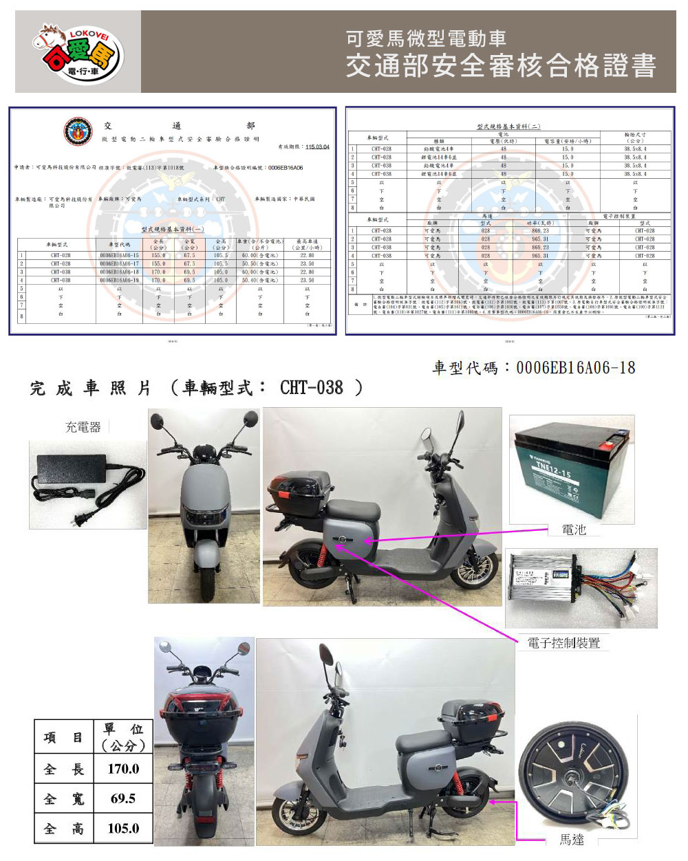 (車架)商品規格:車 型: PEG-070車身尺寸:170*69.5*105cm輪胎尺寸:3.00-10電池型式:鉛酸電池電池規格:48V15AH使用電壓:110v-120v充電時間:6-8小時煞車系統:鼓剎系統及煞車斷電安全裝置控制系統:正弦波電控無刷輪轂馬達最大功率:869.23W 欠壓保護:有最高時速:不超過25km/h續航里程:約20~25km爬坡能力:約10%安全載重量:100kg定速巡航:有前/後方向燈:前有/後有備 註:註1. 續航力會隨著各種因素而變化,例如騎乘重量、坡度、路面情況等等,另外正常情況下電池會逐漸老化,也會影響續航力。註2. 最高續航力為實驗室測試值,模擬55Kg載重於定速25Km下的最高行駛距離,實際續航力因載重條件、個人騎乘習慣、騎乘路況與天候狀況不同而有所差異。註3. 充電時間是電池從零電量至充飽電的耗時,實際充電時間視當時殘餘電力與充電功率大小而定。本商品標準配備:車體 X1保卡及說明書 X1鉛酸電池x1充電器X1(組)後視鏡X1(組)保固內容:以本車所提供之品質保證書內容條款詳述,鉛酸池保固六個月,車架、電機馬達、電子控制器、充電器、保固一年, 各項開關按鈕、轉把、喇叭、DC轉換器保固三個月,外殼塑件、燈泡、車胎、剎車皮屬消耗品無提供保固。 保固適用地區:台灣本島所使用之本公司電動自行車。