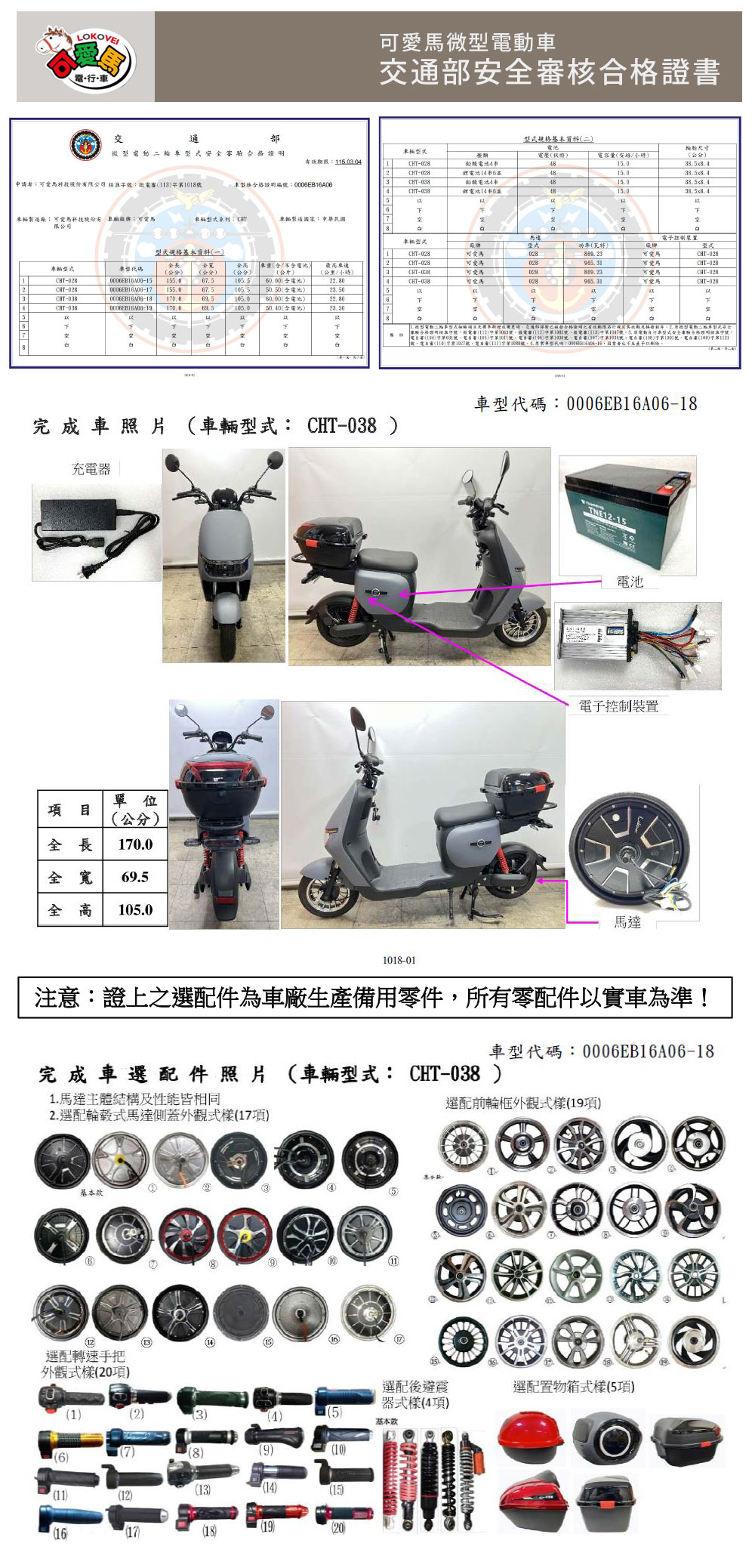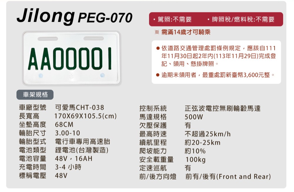 (車架)商品規格:JiLong 微型電動二輪車/電動自行車PEG-070/可愛馬 CHT-038 (16Ah鋰電池版/電動自行車)車 型: PEG-070車身尺寸:170*69.5*105cm輪胎尺寸:3.00-10電池型式:鋰電池/台灣製造(工研院防爆專利配方)電池規格:48V16Ah使用電壓:110v-120v充電時間:3-4小時煞車系統:鼓剎系統及煞車斷電安全裝置控制系統:正弦波電控無刷輪轂馬達 最大功率:869.23W 欠壓保護:有最高時速:不超過25km/h續航里程:約20~25km爬坡能力:約10%安全載重量:100kg定速巡航:有前/後方向燈:前有/後有備 註:註1. 續航力會隨著各種因素而變化,例如騎乘重量、坡度、路面情況等等,另外正常情況下電池會逐漸老化,也會影響續航力。註2. 最高續航力為實驗室測試值,模擬55Kg載重於定速25Km下的最高行駛距離,實際續航力因載重條件、個人騎乘習慣、騎乘路況與天候狀況不同而有所差異。註3. 充電時間是電池從零電量至充飽電的耗時,實際充電時間視當時殘餘電力與充電功率大小而定。(電池)商品規格電池類型:鋰電池(工研院防爆專利配方)BSMI證書號碼:CI458061760026號99識別號碼:R45176電池容量:16AH電池電壓:48V保固時間:2年保固(限本賣場)電池產地:台灣(有量科技製造)註1. 最高續航力為實驗室測試值,模擬55Kg載重於定速25Km下的最高行駛距離,實際續航力因載重條件、個人騎乘習慣、騎乘路況與天候狀況不同而有所差異。註2. 充電時間是電池從零電量至充飽電的耗時,實際充電時間視當時殘餘電力與充電功率大小而定。本商品標準配備:車體 X1保卡及說明書 X1鋰電池x1充電器X1後照鏡X1(組)產品名稱:電動(輔助)自行車用二次鋰電池組Type(型號):ASP-52016Nominal Voltage(額定電壓):48VDCTypical Capacity(額定容量):16AhMax. Current(最大電流):30ACharging(充電):請使用指定的充電器CNS電池名稱:14CNi-Mn-CoP10/99/131製造年份/號碼:依電池上序號顯示製造者:有量科技股份有限公司地址:桃園市龜山區茶專路6號Caution注意:請勿任意丟棄並做好回收處理。請勿置入水中、勿靠近火源與勿自行維修拆解。請勿將電池短路、擠壓、落摔及穿刺。非使用說明書指定機器請勿使用。請勿自行將電池串、並聯使用。騎乘後請立即對電池組進行充電。