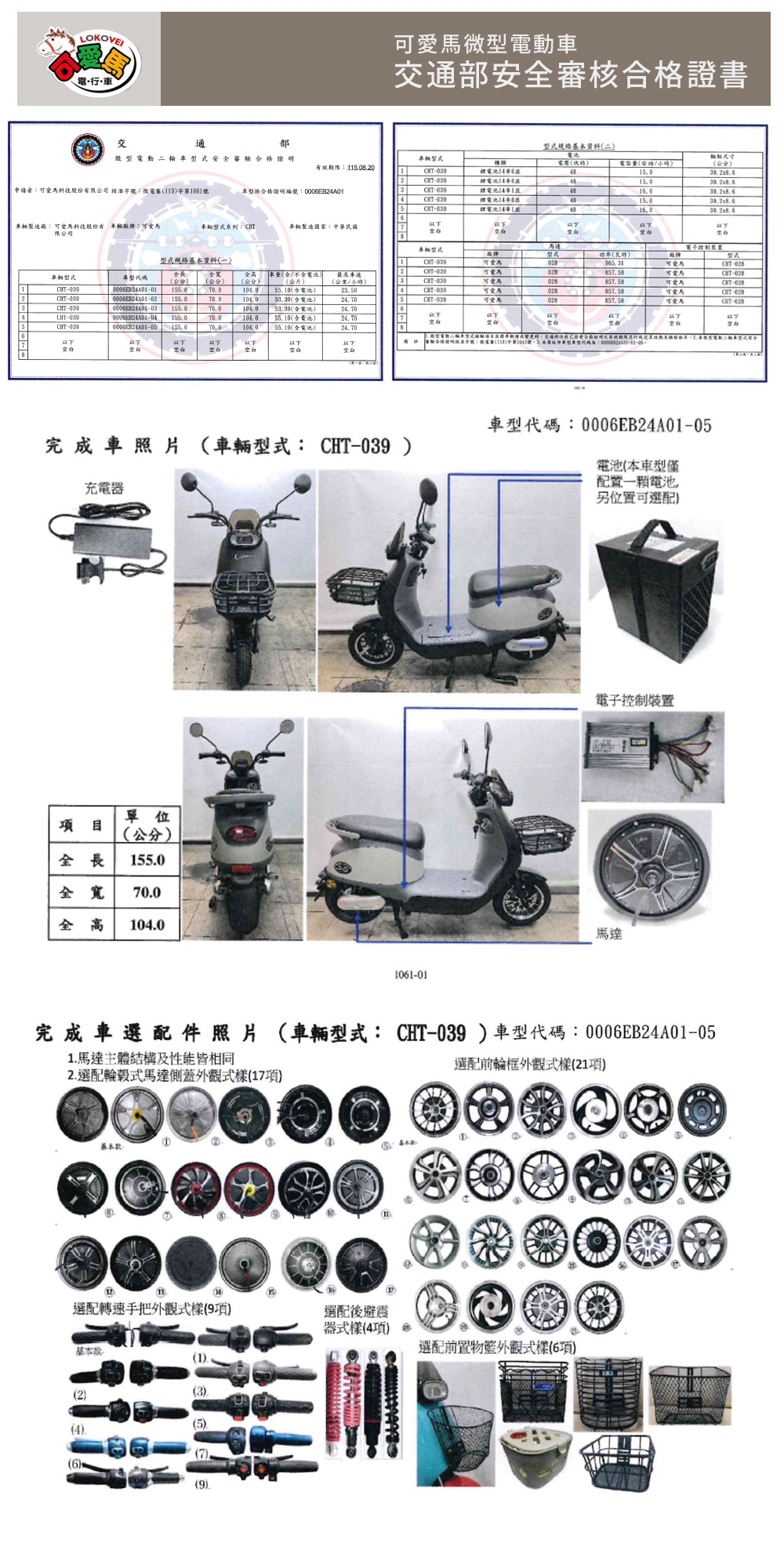 (車架)商品規格:車 型:GOeasy PEG-039 A車廠型號:可愛馬 CHT039 A車身尺寸:155×70×104cm坐墊高度:68CM輪胎尺寸:3.00-10電池型式:鋰電池/台灣製造(工研院防爆專利配方)電池規格:48V16Ah使用電壓:110v-120v充電時間:3-4小時煞車系統:鼓剎系統及煞車斷電安全裝置控制系統:智慧變頻電控無刷輪轂馬達馬達功率:500W欠壓保護:有最高時速:不超過25km/h續航里程:約35~40km爬坡能力:約10%安全載重量:100kg定速巡航:有前/後方向燈:前有/後有備 註:續航力會隨著各種因素而變化,例如騎乘重量、坡度、路面情況等等,另外正常情況下電池會逐漸老化,也會影響續航力。(電池)商品規格電池類型:鋰電池(工研院防爆專利配方)BSMI證書號碼:CI458061760026號99識別號碼:R45176電池容量:16AH電池電壓:48V保固時間:2年保固(限本賣場)電池產地:台灣(有量科技製造)註1. 最高續航力為實驗室測試值,模擬55Kg載重於定速25Km下的最高行駛距離,實際續航力因載重條件、個人騎乘習慣、騎乘路況與天候狀況不同而有所差異。註2. 充電時間是電池從零電量至充飽電的耗時,實際充電時間視當時殘餘電力與充電功率大小而定。本商品標準配備:車體 X1保卡及說明書 X1鋰電池x1充電器X1後視鏡X1(組)產品名稱:電動(輔助)自行車用二次鋰電池組Type(型號):ASP-52016Nominal Voltage(額定電壓):48VDCTypical Capacity(額定容量):16AhMax. Current(最大電流):30ACharging(充電):請使用指定的充電器CNS電池名稱:14CNi-Mn-CoP10/99/131製造年份/號碼:依電池上序號顯示製造者:有量科技股份有限公司地址:桃園市龜山區茶專路6號Caution注意:請勿任意丟棄並做好回收處理。請勿置入水中、勿靠近火源與勿自行維修拆解。請勿將電池短路、擠壓、落摔及穿刺。非使用說明書指定機器請勿使用。請勿自行將電池串、並聯使用。