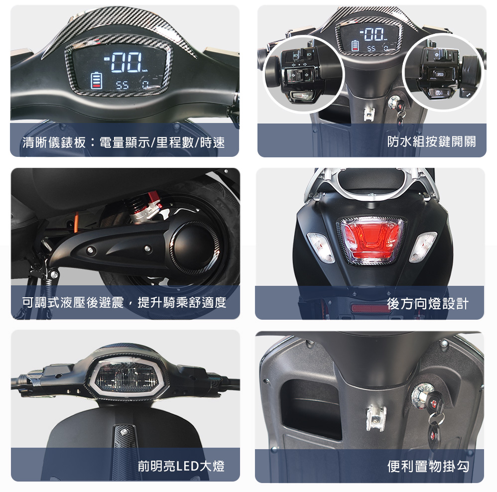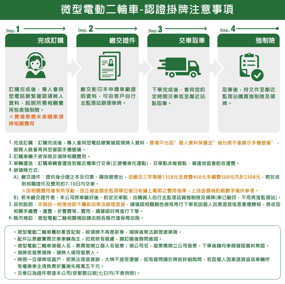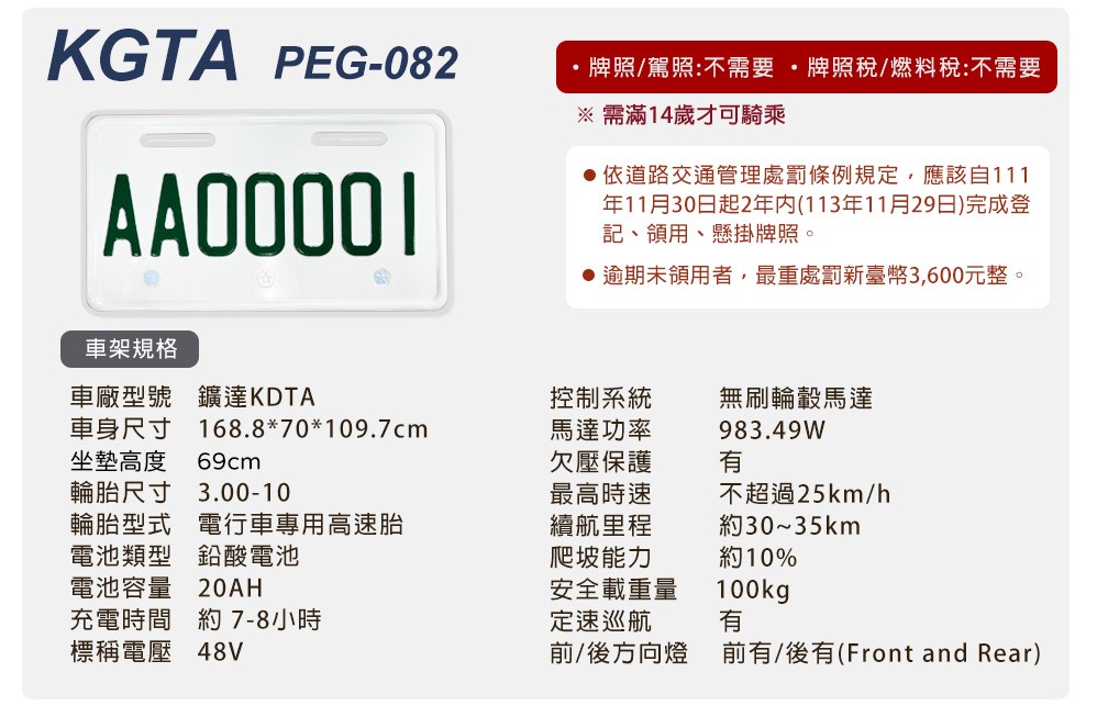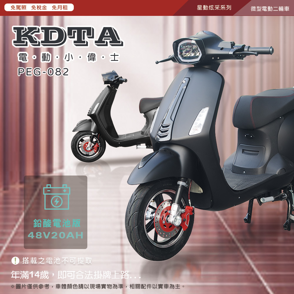 (車架)商品規格:車 型:Mini Hero PEG-082車廠型號:鑛達 小偉士車身尺寸: 168.8*70*109.7cm坐墊高度:69CM輪胎尺寸:3.00-10電池型式:鉛酸電池(不可提取)電池規格:48V20Ah(6個月保固)使用電壓:110v-120v充電時間:6-8小時煞車系統:前後碟剎系統及煞車斷電安全裝置控制系統:正弦波電控無刷輪轂馬達馬達功率:983.49W欠壓保護:有最高時速:不超過25km/h續航里程:約35~40km爬坡能力:約10%安全載重量:100kg定速巡航:有前/後方向燈:前有/後有備 註:續航力會隨著各種因素而變化,例如騎乘重量、坡度、路面情況等等,另外正常情況下電池會逐漸老化,也會影響續航力。(電池)商品規格:電池類型: 鉛酸電池(無法提取)識別號碼:R65387電池容量: 48V20AH電池電壓: 48V保固時間:6個月保固註1. 最高續航力為實驗室測試值,模擬55Kg載重於定速25Km下的最高行駛距離,實際續航力因載重條件、個人騎乘習慣、騎乘路況與天候狀況不同而有所差異。註2. 充電時間是電池從零電量至充飽電的耗時,實際充電時間視當時殘餘電力與充電功率大小而定。本商品標準配備:車體 X1保卡及說明書 X1鉛酸電池x1充電器X1後視鏡X1(組)Caution注意:請勿任意丟棄並做好回收處理。請勿置入水中、勿靠近火源與勿自行維修拆解。請勿將電池短路、擠壓、落摔及穿刺。非使用說明書指定機器請勿使用。請勿自行將電池串、並聯使用。騎乘後請立即對電池組進行充電。1年保固期保固內容:以本車所提供之品質保證書內容條款詳述,鉛酸電池保固半年(只限本賣場),車架、電機馬達、電子控制器、充電器、保固一年, 各項開關按鈕、轉把、喇叭、DC轉換器保固三個月,外殼塑件、燈泡、車胎、剎車皮屬消耗品無提供保固。 保固適用地區:台灣本島所使用之本公司電動自行車。
