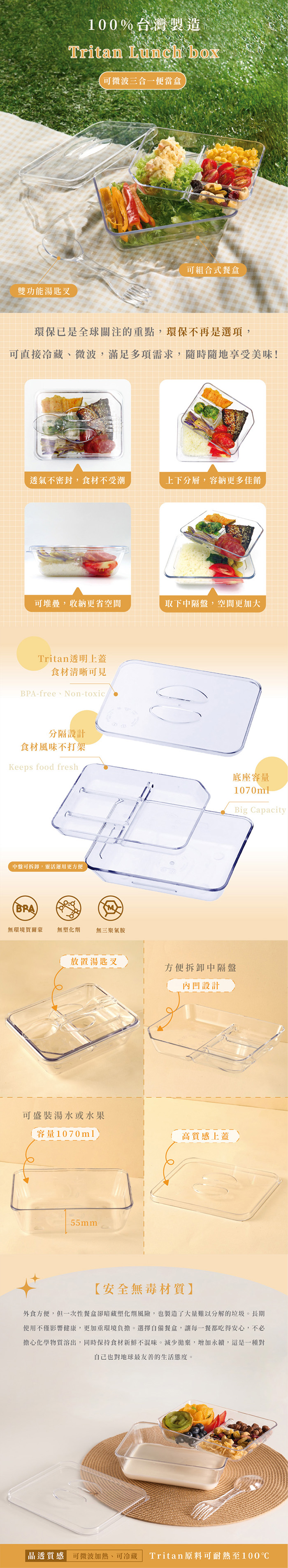 【商品規格】品名:哩皿三合一餐盒材質:Tritan(改質PCT)耐熱溫度:原料100℃尺寸:上蓋 196x156x16 mm、中盤 182x142x30 mm、下座 190x150x56 mm產地:台灣有效期限:五年回收:回收標誌7號,可封閉式回收【產品使用注意事項】1. 本產品僅供食品接觸用途。2. 本產品符合循環經濟,可回收再製粒做工業循環使用。 3. 本產品通過中華民國食品容器規範檢驗。 4. 本產品可用紫外線消毒。 5. 本產品可重複使用。6. 本產品非調理器具,請勿直接置於火源上。7. 請勿加熱空食器。8. 清潔時,請勿使用硬物、鋼刷或粗菜瓜布。9. 勿將Tritan餐具盛裝含高油脂內容物進微波爐加熱,加熱的時間不要超過2分鐘(限用900W(相等)或以下功率)。【貼心提醒】🔸食器可用於微波爐、洗碗機、烘碗機、蒸氣/紫外線消毒鍋。🔸商品顏色僅供參考,色樣會因電腦螢幕設定不同而有誤差,顏色以實際商品為主。