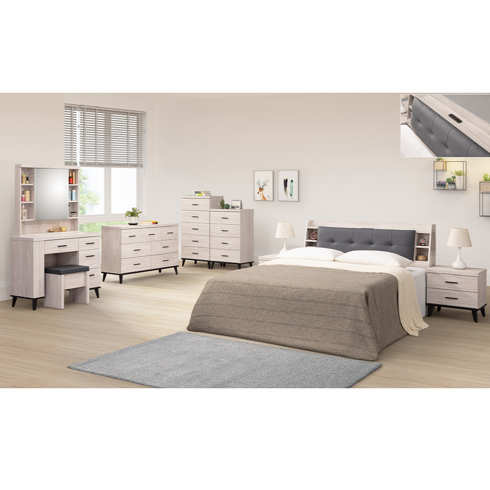 『淺色風化木紋搭配黑色金屬把手與穩固的高腳設計,為您的臥室增添優雅氛圍。讓您每天的梳妝時光更加愉悅舒適』