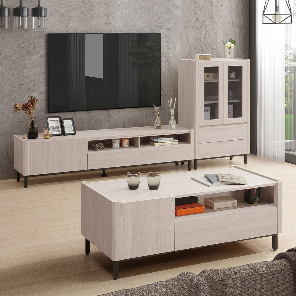 多樣化收納空間:結合隱藏式櫃體、開放空間與抽屜 三種收納方式,讓您能依照物品特性分類存放,使客廳保持整潔。