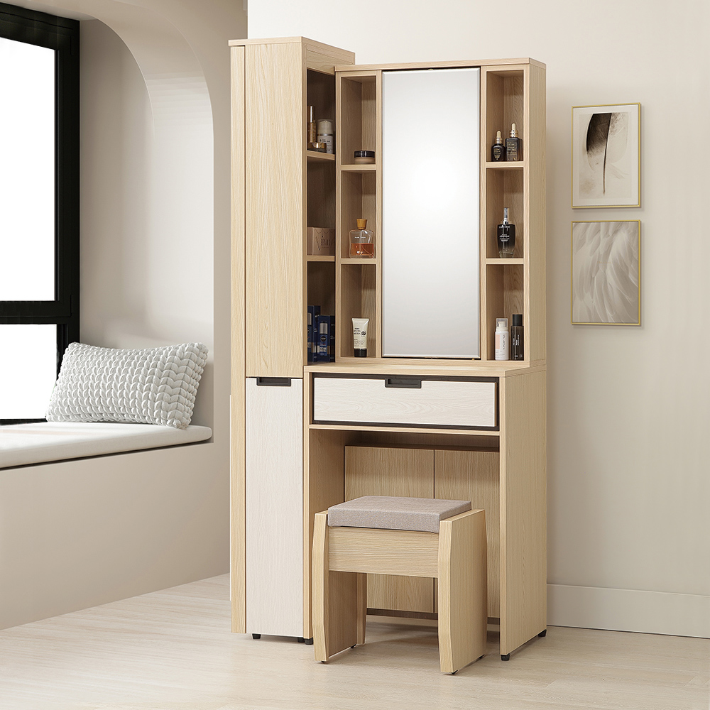 收納空間:採用多層次、多功能的立體化設計,右側化妝桌上座設有開放式隔層及旋轉鏡面,可擺放日常用品並兼具防塵;下座配置了實用抽屜,適合存放化妝工具與飾品;左側的側櫃能收納化妝品或備用物品,並設有推拉式全身鏡面。化妝椅座墊可掀開,提供了額外的隱形收納空間,所有物品都能有專屬位置。