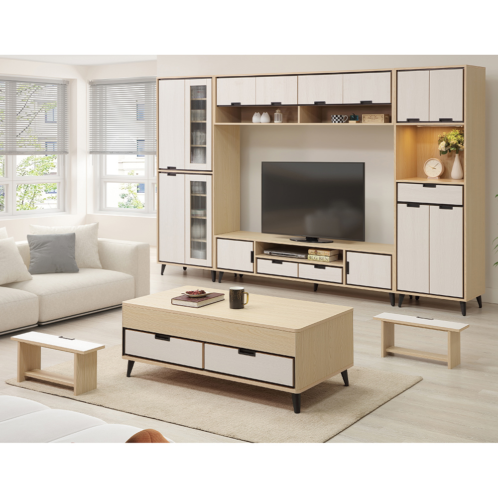 大茶几設計:以原木色木紋搭配白色面板,營造清新自然的視覺感受。多功能升降桌面提升了使用的便利性與實用性。圓潤的邊角處理,搭配時尚的黑色斜角桌腳,不僅增添了安全性,也透過和諧的撞色效果,提升了整體的層次感與現代感。