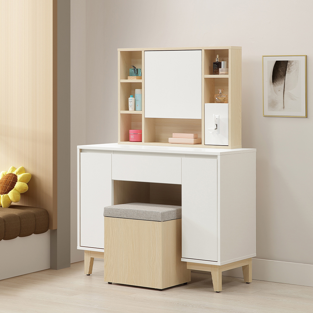 收納功能:上層的隱藏式鏡櫃提供防塵且避免陽光直射的收納,兩側設有開放層架和貼心的面紙抽取盒;桌櫃兩側設置垂直拉出式雙層抽屜,能讓大量瓶罐分類清晰、拿取方便;多功能收納椅凳提供額外的彈性收納,讓所有化妝與保養用品都能擁有專屬歸宿。