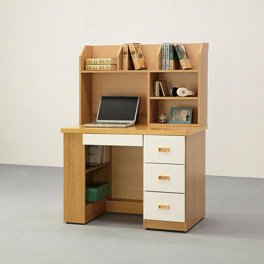 收納功能:上方書架設有不同高度的分隔空間,方便擺放書籍、收藏品或裝飾小物;書桌配置三+一格抽屜,可將文具、文件與私人用品分門別類收納,維持桌面清爽整潔;側邊的開放式層架則適合放置常用文件盒或收納箱,實現機能性與美感的完美平衡。