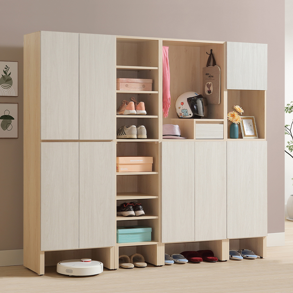 收納空間:上層開放空間可放置使用頻率較高的物品,例如:包包、寵物牽繩或安全帽;左右兩側設置掛勾,帽子、圍巾都能隨手掛放,小抽屜可以放置襪子、手套或鑰匙;下方櫃門內部設有多層活動隔板,可以根據鞋子的高度自由調。