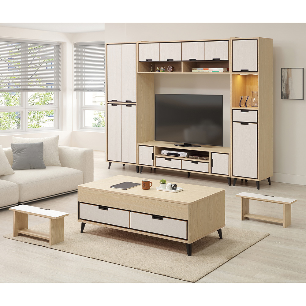 收納空間:上下兩組對稱的雙門大櫃,提供了隱藏空間,能夠將雜物、鞋履徹底收納,實現空間的極簡與整潔。上下分層的結構,方便使用者依物品性質或使用頻率進行分類管理。