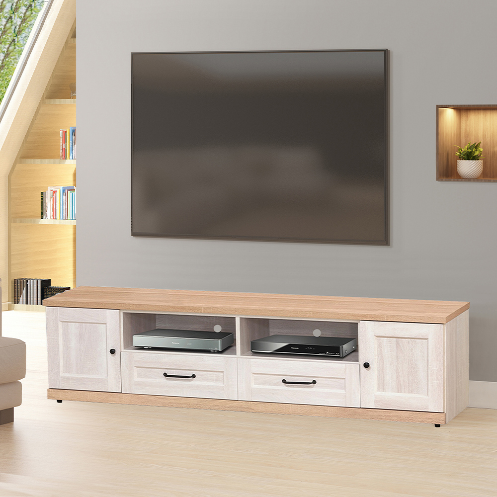 收納功能:兩側設有櫃門內設有置物空間,適合存放高度較高的物品;中央兩組抽屜,方便收納遙控器、電線等生活小物;抽屜上方留有開放式影音設備層,背板貼心預留圓形電線孔洞,讓機上盒或播放器的線材整齊不凌亂,機能配置完善且對稱。