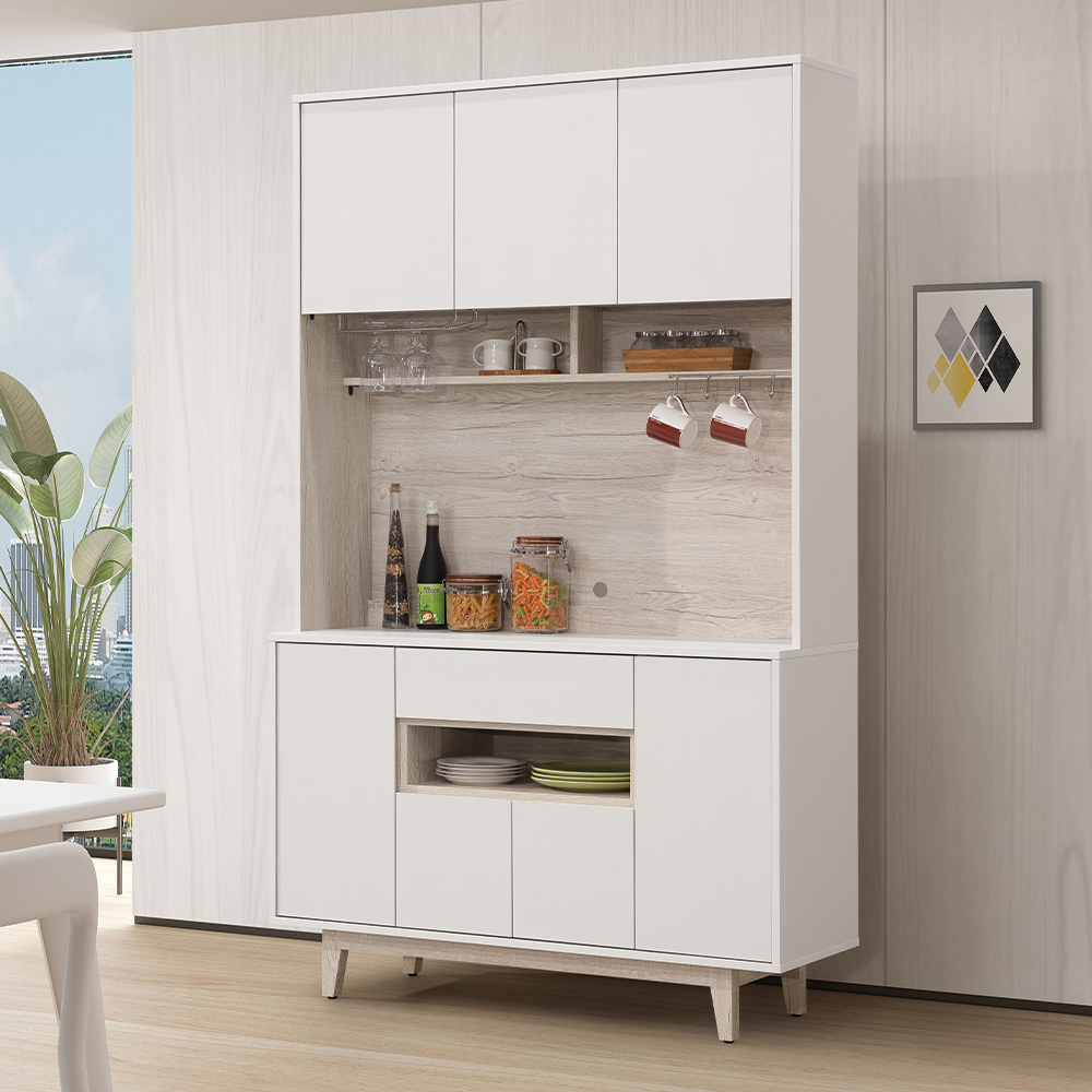 收納功能:上層設有三面櫃門,適合儲藏不常使用的器皿或乾貨,達到防塵效果;中間開放區域、紅酒杯架與實用掛鉤,方便隨手取用酒杯與咖啡杯;下層餐櫃結合抽屜及櫃門提供足夠的空間來收納餐具、大件鍋具或餐墊等物品,保持桌面整齊乾淨,讓餐廚空間既美觀又高效。