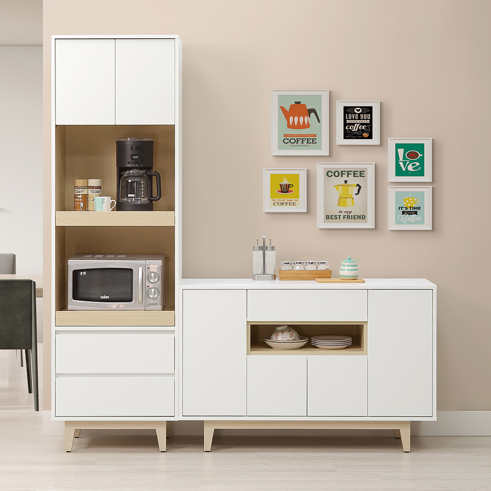 收納功能:抽屜適合存放餐具與零散小物;門櫃內部設有靈活隔板,能妥善隱藏各式碗盤、罐頭或茶包;中間的開放式層隔則提供了展示常用器皿或裝飾品的空間,讓收納不再單調,既實用又兼具視覺美感。
