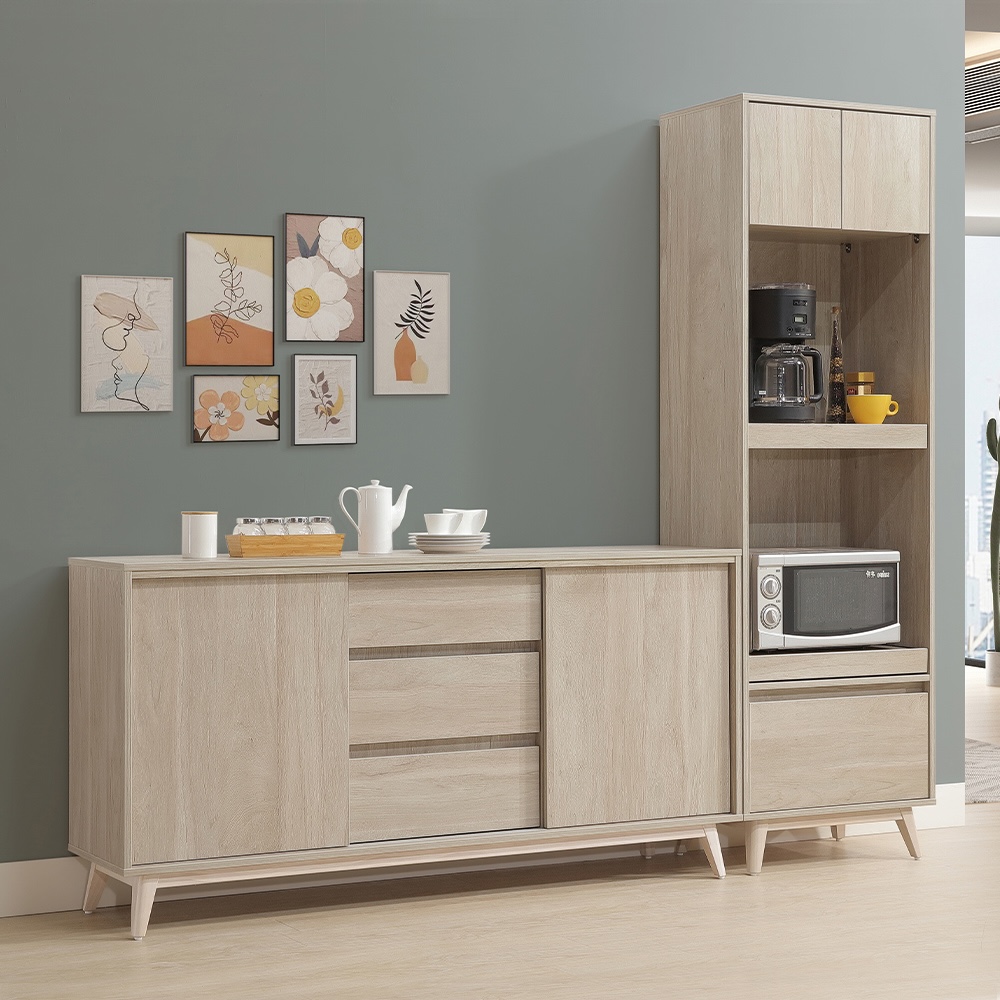 收納功能:設有專屬雙層電器托盤抽屜,適合擺放咖啡機、微波爐等常用家電,操作順手;上方雙門櫃與下方抽屜可收納零食、備品或不常用的餐具,保持空間整潔不凌亂。功能配置層次分明,滿足日常多元收納需求。