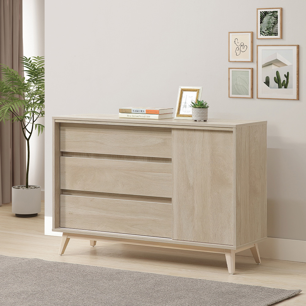 收納功能:收納櫃採三抽一門的分區設計,三層大容量抽屜方便分類收納日常小物或摺疊衣物;右側獨立門櫃內部高度充足,包包、文件或較高的家居備品都能輕鬆放好。上方檯面可作為置物平台,擺放花藝或香氛,為空間增添剛剛好的儀式感。