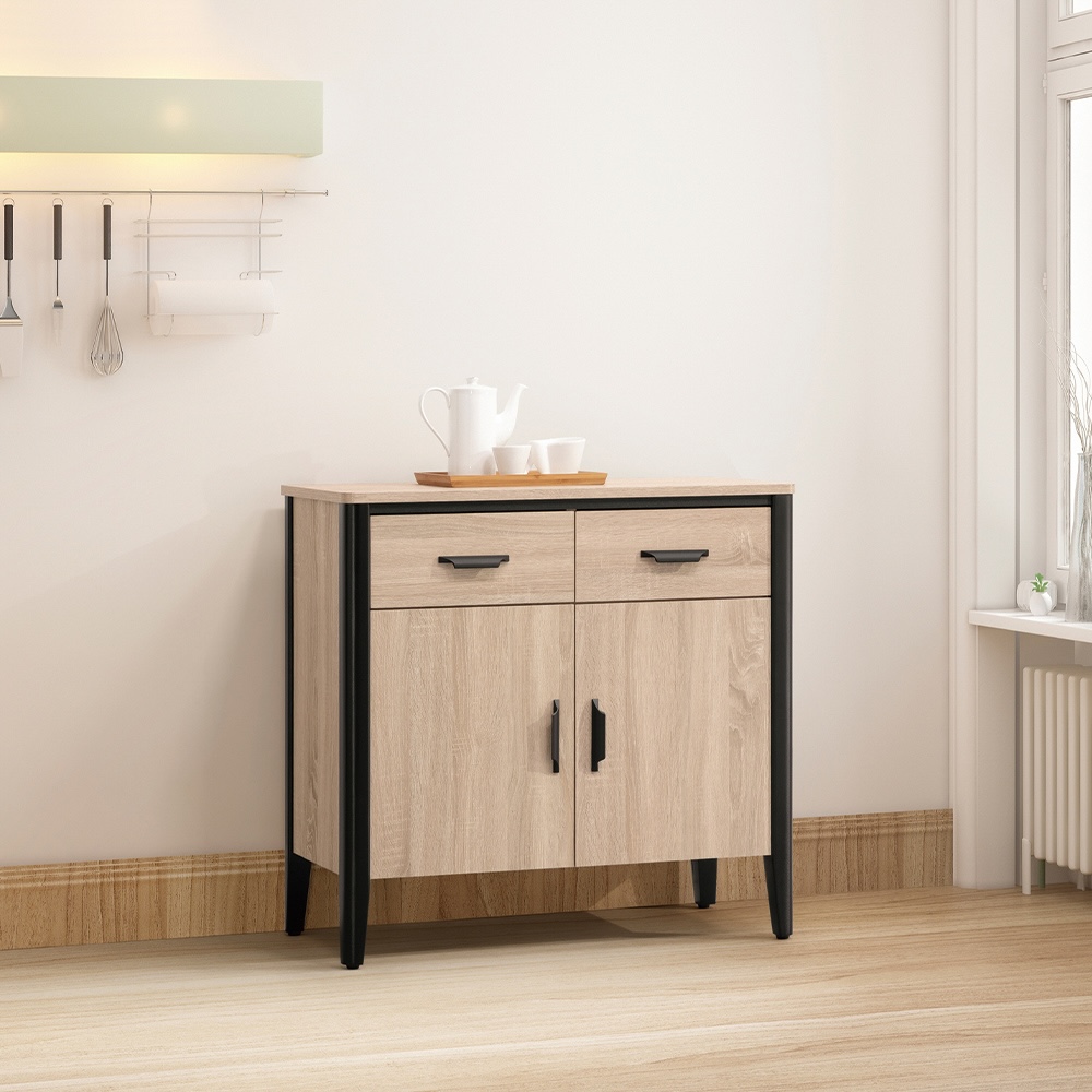 收納功能:檯面可作為備餐或電器工作區;兩個抽屜方便分類收納零散餐具,櫃門則能收納大型物品、鍋具與碗盤,完美滿足餐廚空間的多功能儲物需求。