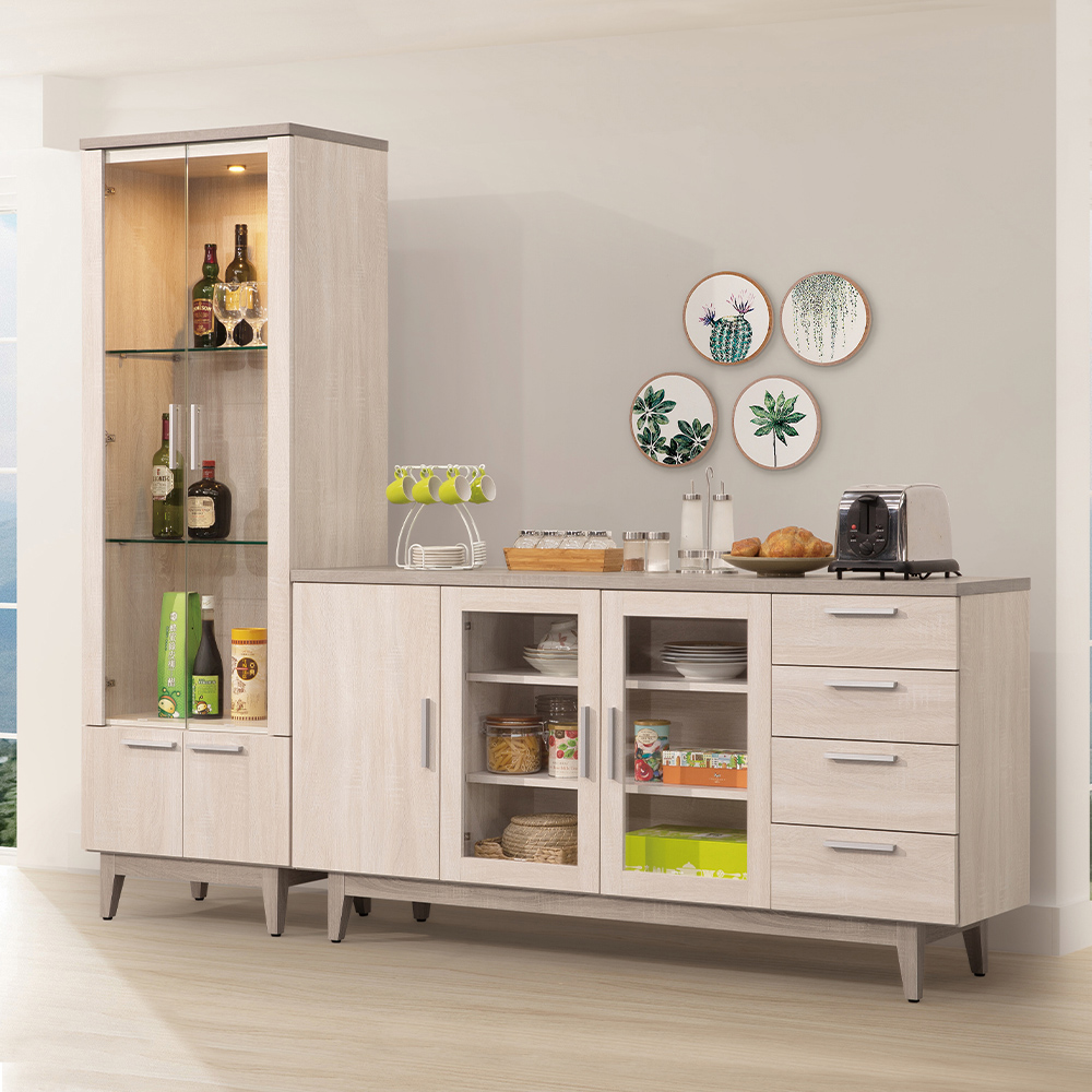 外觀設計:運用米白色櫃體與灰橡色系的頂板與底座點綴,搭配銀色金屬手把為整體增添了豐富的層次與精緻感;底部木質腳柱支撐,讓穩重的櫃體多了一份設計的靈動力。