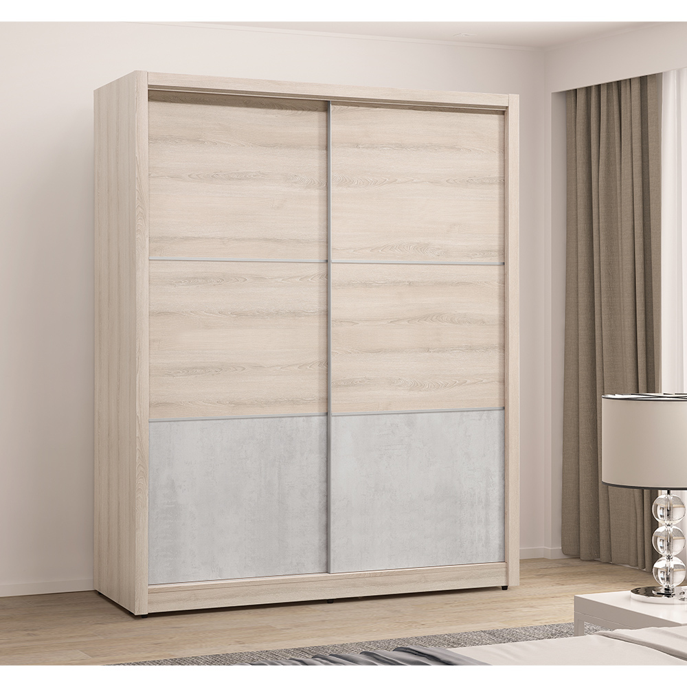 衣櫃設計:以溫潤的霧白橡木色為基調,搭配岩灰色美耐皿板點綴,形成多層次的視覺感。雙門滑門開合順暢,收納更靈活,衣物、大型寢具或行李箱都能有條不絮的安放。