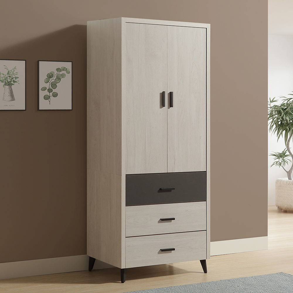 收納功能:上方提供單層吊掛空間,為大衣、長裙提供垂直懸掛環境,可避免衣物因擠壓而產生皺褶。下方三層抽屜,是收納貼身衣物、襪子或貴重飾品的絕佳私密空間,不僅實用,更能維持櫃面視覺上的高度簡潔與平整。