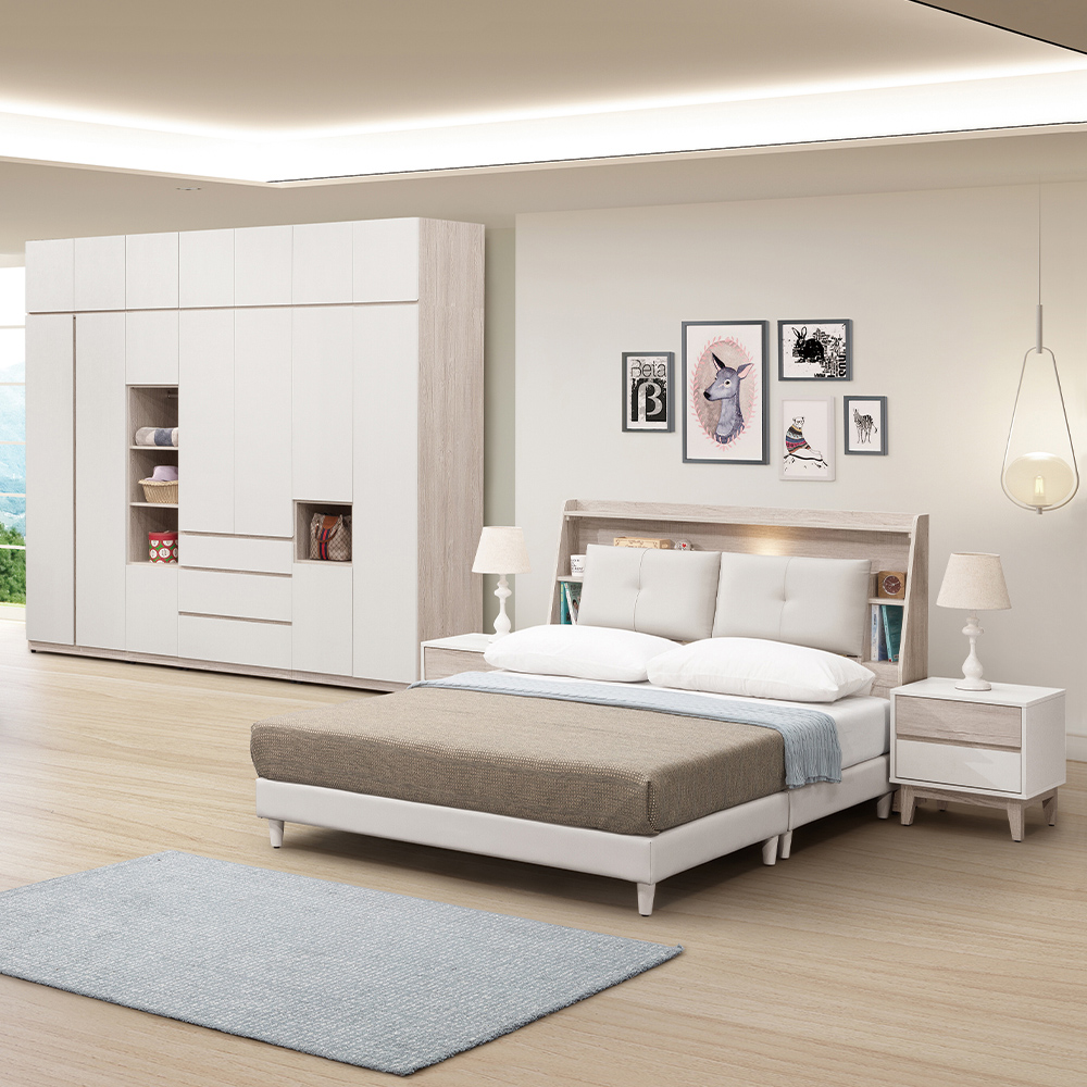 床頭箱設計:以輕盈的白橡木紋為主調,透過幾何梯形設計,有效減輕傳統床頭箱的笨重感。米灰色貓抓皮軟墊,以厚實柔軟的質感,完美平衡木質的硬度,提供舒適的依靠。暖黃光照明及充電裝置,不僅功能實用,更為空間注入了溫馨療癒的居家氛圍在。