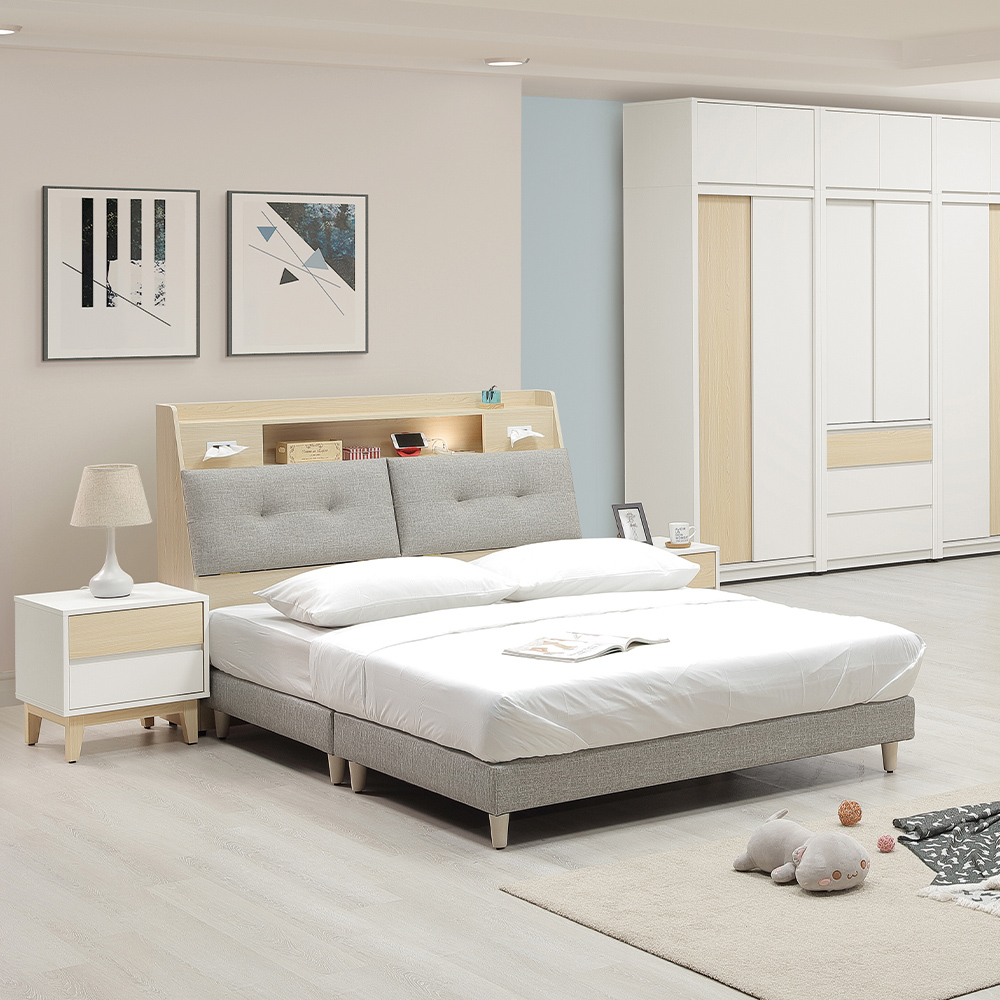 外觀設計:以溫暖原木色為主調,搭配灰色貓抓皮靠枕,不同材質交錯在一起,視覺上很有層次。拉鈕設計為床頭增添立體細節,側邊的弧形線條柔化了家具本身的份量感;暖色小夜燈,整體氛圍變得更柔和、有質感。
