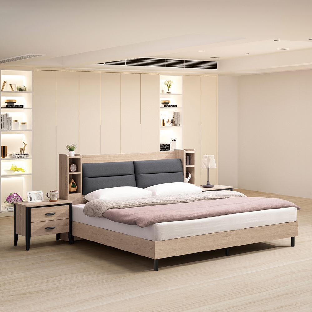收納功能:兩側配置開放式置物格,能收納睡前讀物、耳機,也能擺放時鐘或香氛;寬敞的箱型大容量底層,適合放置大型寢具或玩偶。床頭箱的功能完美整合於床架中,節省空間且提升生活便利性,讓隨手拿取物品變得優雅自如。