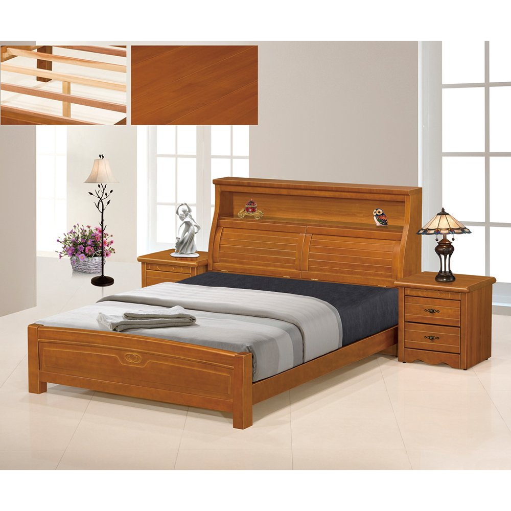 外觀設計:經典柚木色的溫潤質感,將自然木紋與工藝美學完美融合。圓潤流線型設計,搭配床尾細緻的浮雕,營造和諧且安定的視覺美感;多功能收納床頭結合了上方開放式置物平台與內置隱藏空間,不僅方便拿取隨身小物,更能維持空間的俐落整潔。傳統木作的溫實與現代生活的機能需求,是一件能讓臥室瞬間充滿溫暖氣息的家具。
