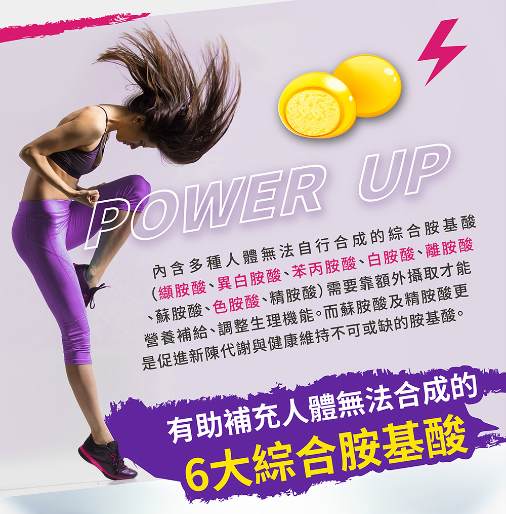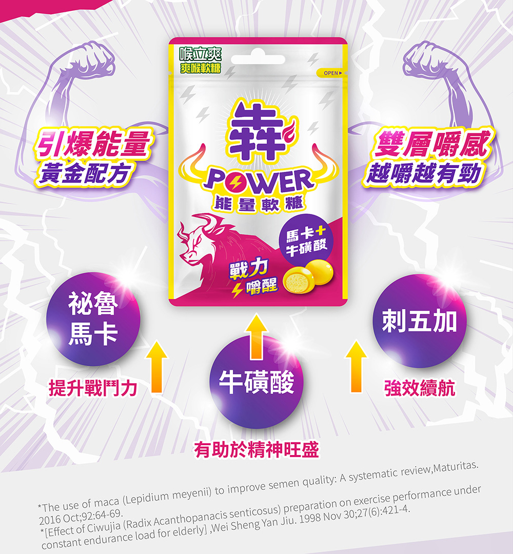 砂糖、麥芽糖、椰子油、明膠、檸檬酸(調味劑)、檸檬濃縮果汁、牛磺酸、綜合胺基酸(纈胺酸、異白胺酸、苯丙胺酸、白胺酸、離胺酸、蘇胺酸、色胺酸、精胺酸)、維生素C(抗氧化劑)、瓜拿那萃取物、香料、綜合維生素B群(菸鹼醯胺、維生素B6、維生素B1、維生素B2、維生素B12、麥芽糊精、本多酸鈣、重酒石酸膽鹼、乳酸)、五味子萃取物、馬卡萃取物、刺五加萃取物、天然食用色素(薑黃色素)、薄荷、棕櫚蠟(食品製造用劑)。