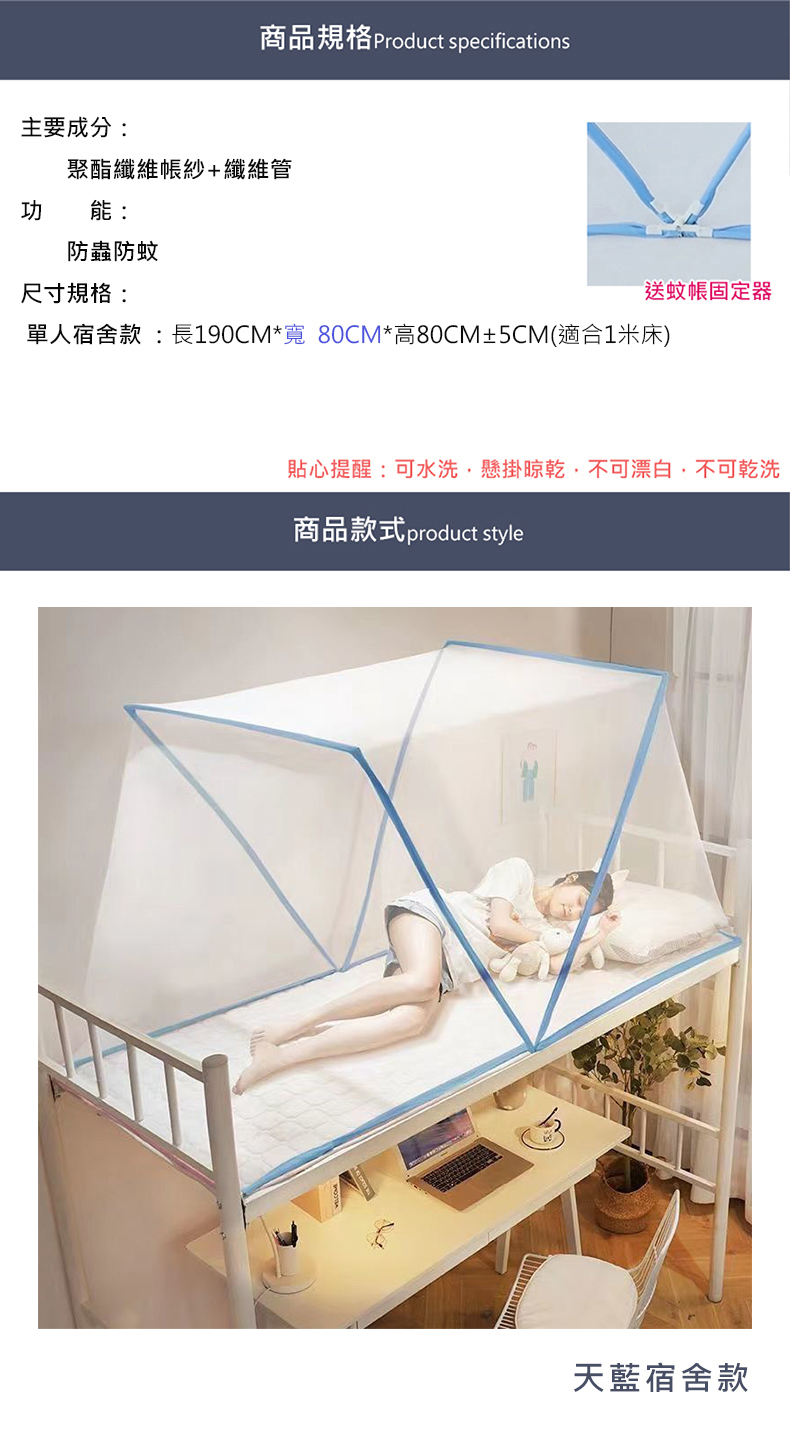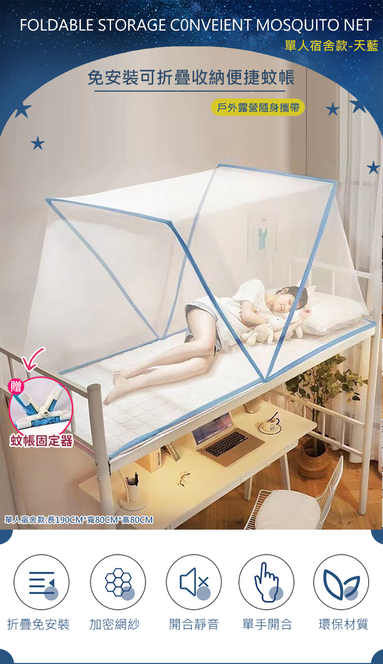 [喵到寶] 好睡覺 好收納免安裝可折疊無底蚊帳單人宿舍款-天藍