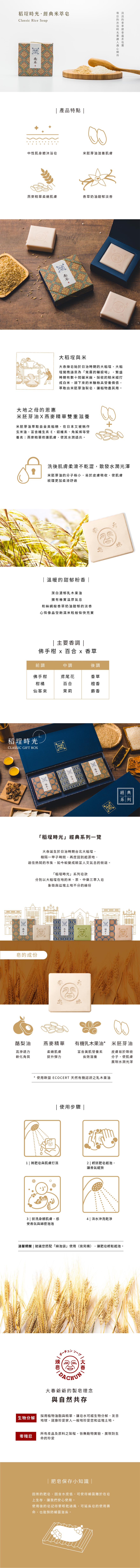 特色:鎖水滋潤適用:中性、混合肌膚香氛:香草甜郁粉香• 專為中性肌膚設計的身體沐浴皂• 以大稻埕在地材料入皂,自金黃稻穗中萃取的米胚芽油,富含營養素,滋潤鎖水• 燕麥精華柔嫩肌膚,提升彈力• 奶油般的甜郁淡香