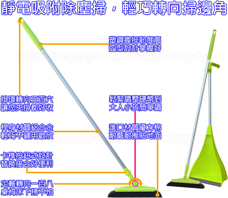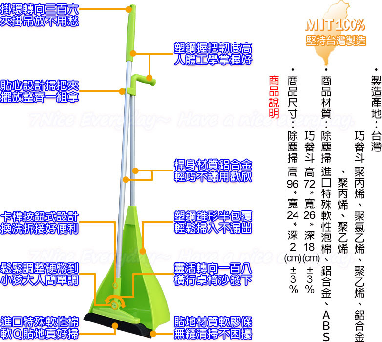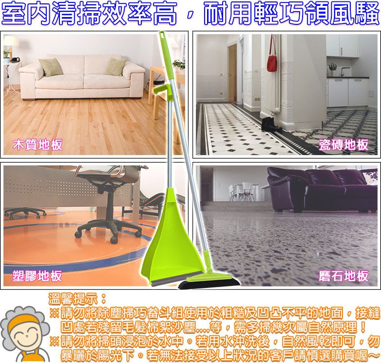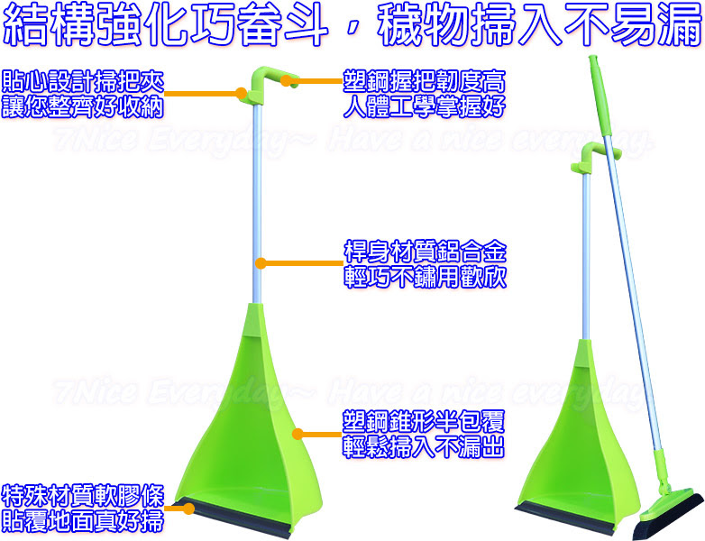 掃把:進口特殊軟性泡綿、鋁合金、ABS、聚丙烯、聚乙烯 畚斗:聚丙烯、聚氯乙烯、聚乙烯、鋁合金