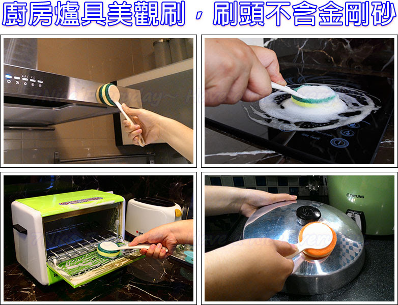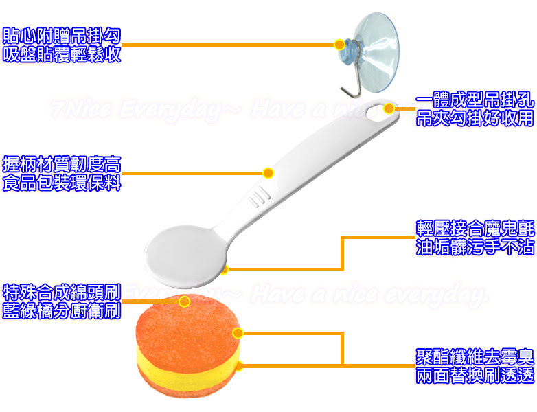 不織布纖維構造,有效清潔污垢。菜瓜布雙面設計,節約又便利。快速刷除廚房油汙髒污,浴室水垢皂垢。獨家設計免沾手握柄,平均施力好省力。