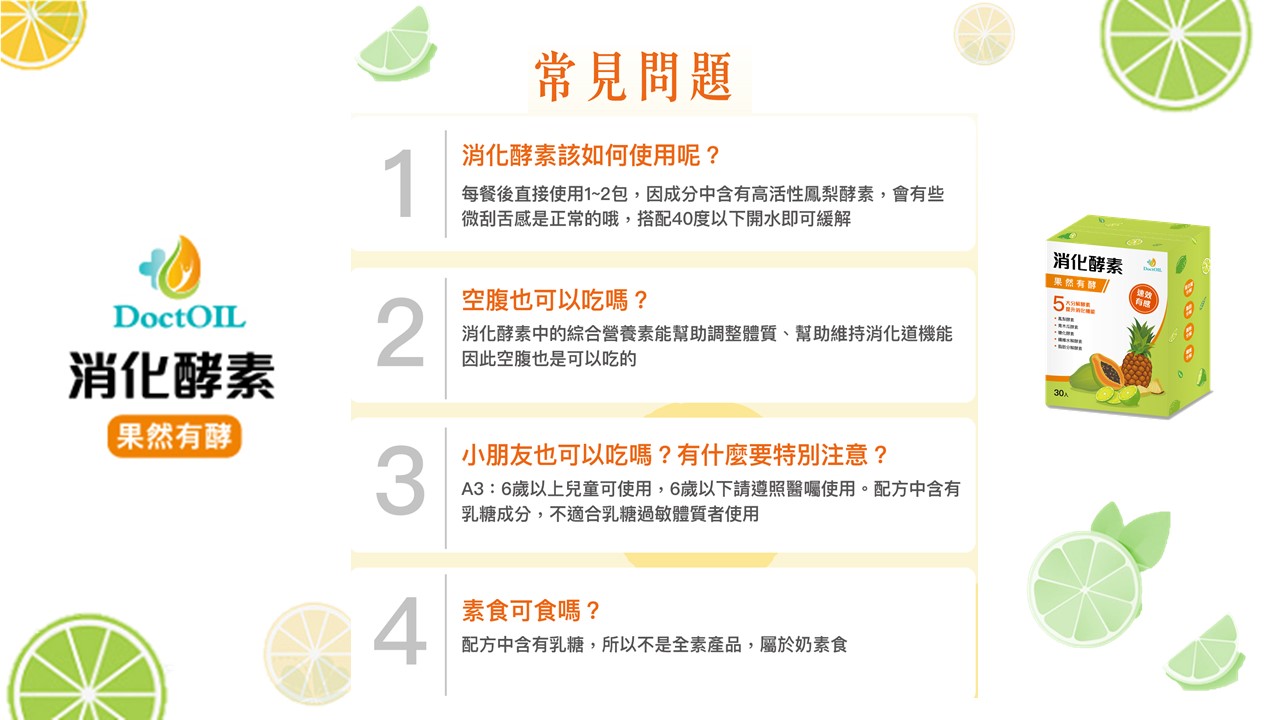 品 名:果然有酵消化酵素-30小條/包成 分:綜合蔬果抽取物(乳糖、鳳梨萃取物(含鳳梨酵素)糖化酵素、纖維分解酵素、青木瓜萃取物(青木瓜酵素、脂肪分解酵素)檸檬萃取物(含維他命C)麥芽糊精)海藻糖、麥芽糊精內 容 量: 30小條/包 (2克/條)保存期限:二年產 地:台灣保存方式:請置於乾燥、陰涼通風處、避免陽光直射。食用方法:每日餐後、直接食用或以冷開水沖泡後食用(水溫不超過40 ℃)建議用量:兒童每次1包,成人每次1-2包注意事項:本產品含有乳醣,過敏者請斟酌食用。