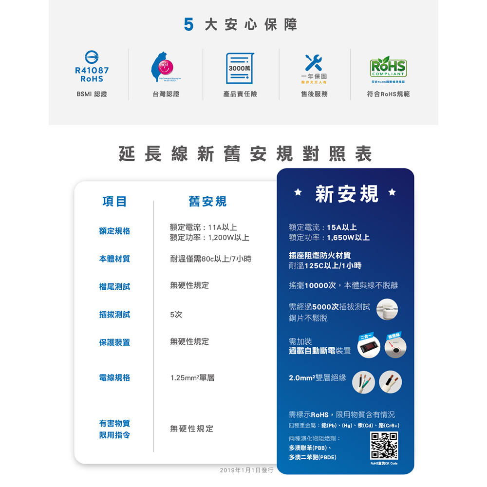 產品特色 過載自動斷電 插座防火PC料 雙層被覆電源線 高耐熱刃片基座 防誤觸內陷開關 符合最新國家法規 本產品已投保3000萬產品責任險 產品規格 規格:CK3166-06尺(1.8米) 額定容量:125VAC 15A MAX 1,650W 使用電壓:AC 110V 60Hz 線材規格:VCTF 2.0m㎡x3C 尺寸:長248x寬43x高30mm 材質:銅、阻燃防火PC料 包裝尺寸:寬12.5cm長37cm高5cm 包裝重量:515g 驗證登錄:R41087 保存期限:10年 產地:台灣