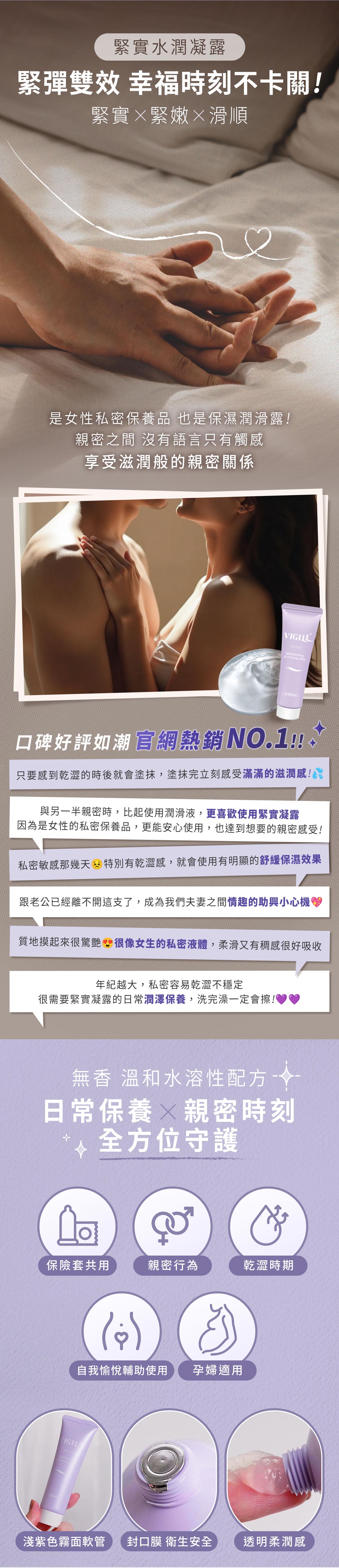私密專用青春水潤配方!彈。潤。緊。護彈- 添加山藥萃取,植物性青春幸福成分,幫助私密肌回復彈力潤澤。潤- 蘆薈精華與小分子海藻糖,模仿女性私密滑潤感,絲緞般豐潤飽滿。緊- 燕麥的低分子多醣及柑橘萃取,能幫助緊緻肌膚,搭配凱格爾運動效果更好。護- pH3.5~4.5私密專用酸性配方,含德國洋甘菊水性精華及維他命E衍生物,修護肌膚舒緩不適感。〔不含香精、精氨酸,孕婦、哺乳媽媽亦適用〕