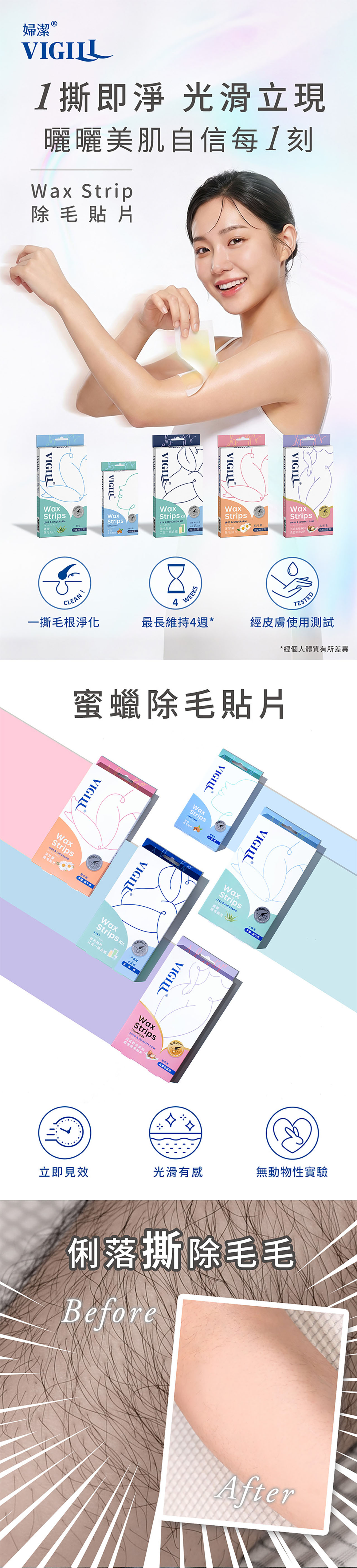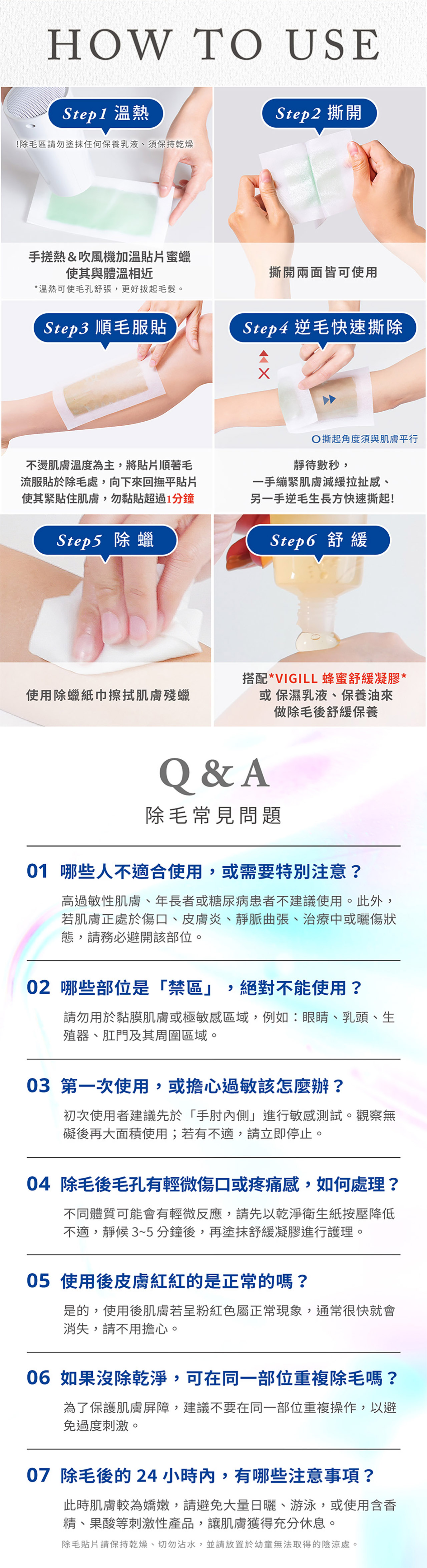 婦潔蘆薈除毛貼片能溫和深入毛囊,將毛髮連根拔除,最久可維持4週光滑肌膚。另添加蘆薈(Aloe Vera)天然舒緩配方,除毛同時能呵護細緻肌膚,給予肌膚滋潤舒緩。1. 溫熱:將貼片放在雙手間搓熱5秒鐘,稍微溫熱使其於體溫相近。2. 撕開:慢慢撕開貼片,兩面皆可使用,直到不黏為止。3. 緊貼:將蠟紙緊貼於欲除毛處,向下來回撫平貼片,使其緊緊貼住肌膚。4. 撕除:一手緊按肌膚,另一手以快速俐落的動作,「逆毛髮生長方向」快速撕除貼片。動作越快,效果越好!5. 清潔:可使用剛使用過的蠟紙黏掉皮膚上殘餘的蠟,並用附贈的除蠟潤膚濕紙巾擦拭掉,也可使用家中紙巾沾取橄欖油或嬰兒油清潔殘餘的蠟。6. 舒緩:除後搭配使用婦潔舒緩產品,效果更好。