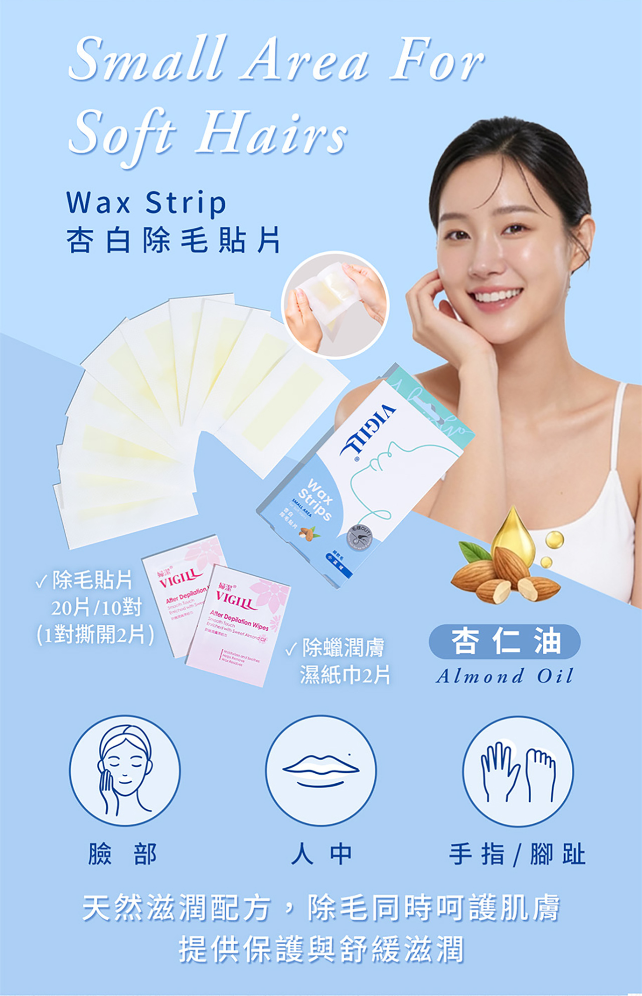 除毛貼片─ 能溫和深入毛囊,將毛髮連根拔除,最久可維持4週光滑肌膚。另添加杏仁油 (Almond Oil)天然滋潤配方,除毛同時能呵護嬌嫩的肌膚,提供肌膚滋潤舒緩。1. 溫熱:將貼片放在雙手間搓熱5秒鐘,稍微溫熱使其於體溫相近。2. 撕開:慢慢撕開貼片,兩面皆可使用,直到不黏為止。3. 緊貼:將蠟紙緊貼於欲除毛處,向下來回撫平貼片,使其緊緊貼住肌膚。4. 撕除:一手緊按肌膚,另一手以快速俐落的動作,「逆毛髮生長方向」快速撕除貼片。動作越快,效果越好!5. 清潔:可使用剛使用過的蠟紙黏掉皮膚上殘餘的蠟,並用附贈的除蠟潤膚濕紙巾擦拭掉,也可使用家中紙巾沾取橄欖油或嬰兒油清潔殘餘的蠟。6. 舒緩:除後搭配使用婦潔舒緩凝膠產品,效果更好。