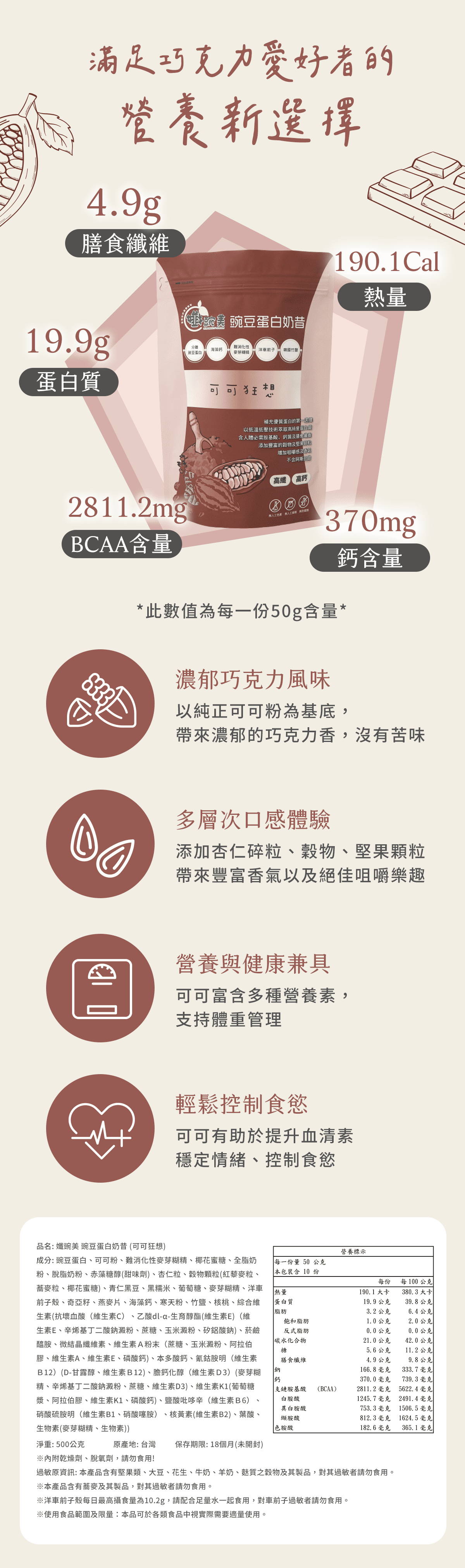 每一份量50公克,本包裝含10份,每份熱量190.1大卡,蛋白質19.9公克,脂肪3.2公克,飽和脂肪1.0公克、反式脂肪0.0公克,碳水化合物21.0公克,糖5.6公克,膳食纖4.9公克,鈉166.8毫克